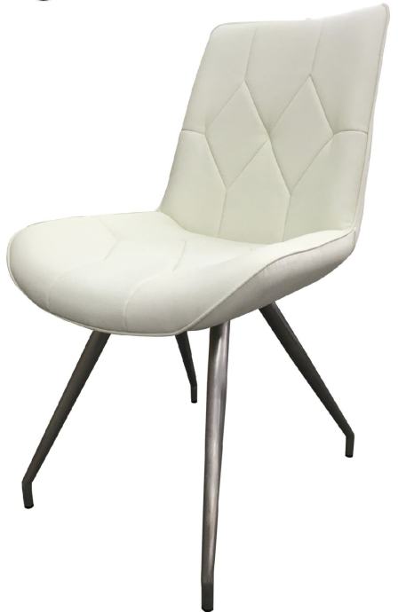 Sjedalo i naslon presvučeni su štofom, u žućkasto bijeloj boji. Noge u obliku okrugle cijevi su od nehrđajućeg čelika.
