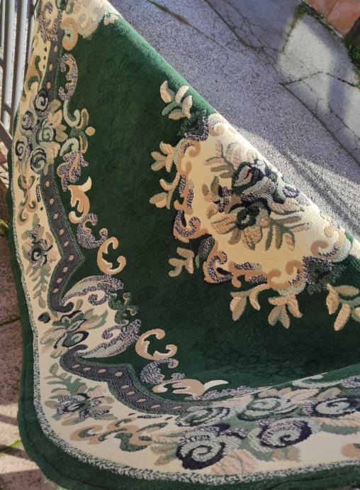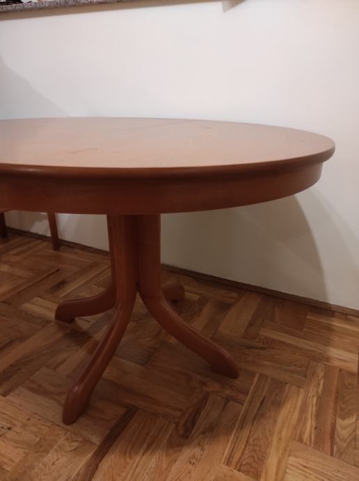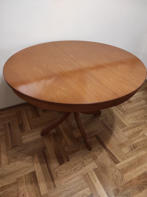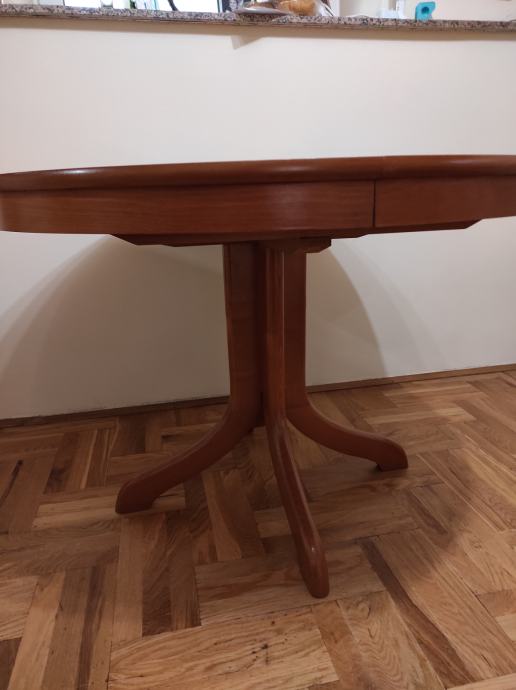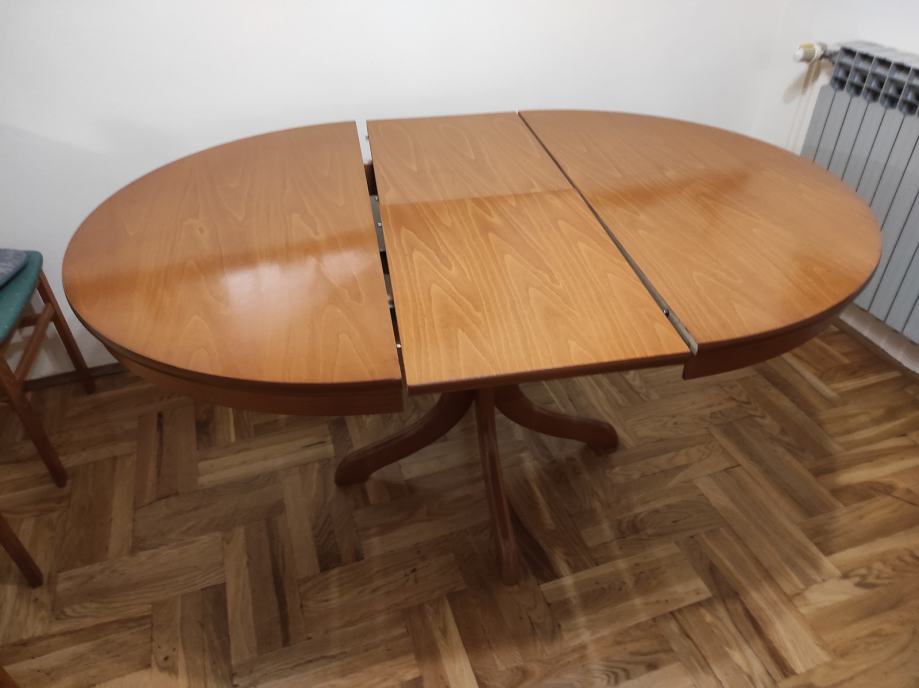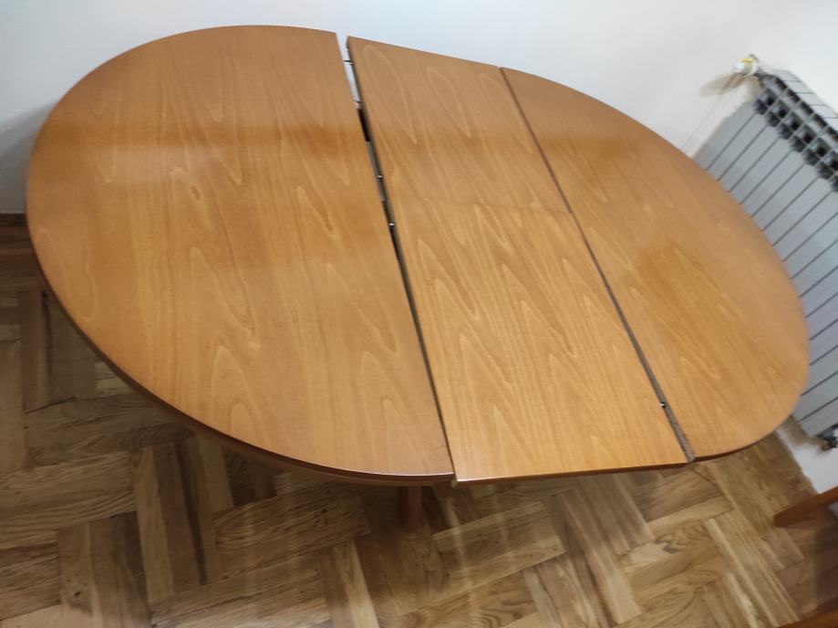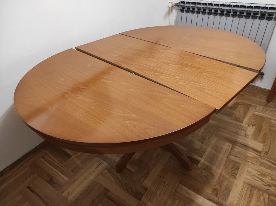 Prodajem okrugli drveni masivni stol od bukve i boje bukve na razvlačenje 110/150, stol je očuvan, ispod ploče stola na dijelu spoja polukruga ima malo oštečenje od 1cm (vidljivo na slici) i na mehanizmu za razvlačenje puknuti panti, stol se može razvuči i postaviti i bez toga i uz zamjenske pante podesiti za lagodniju upotrebu, uz stol poklanjam i ovalni zelenkasto-kremasti tepih dimenzija 2.14m x 1.58m