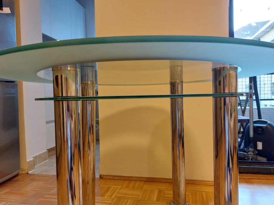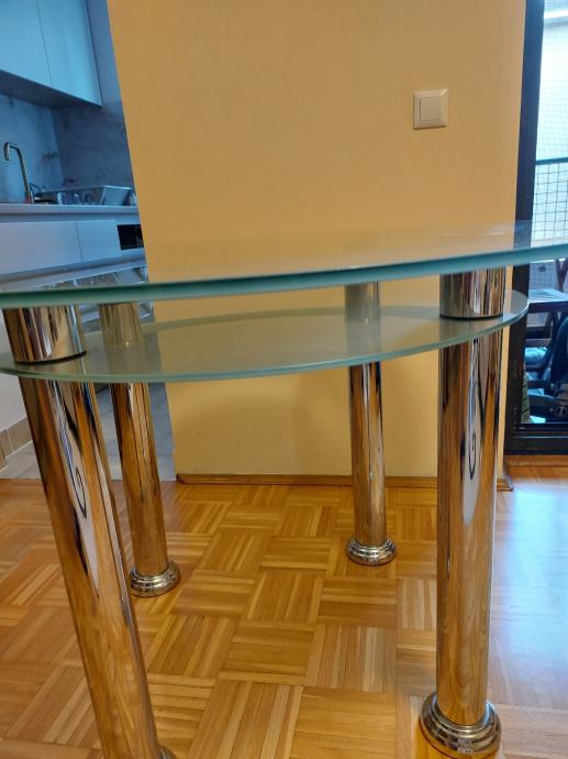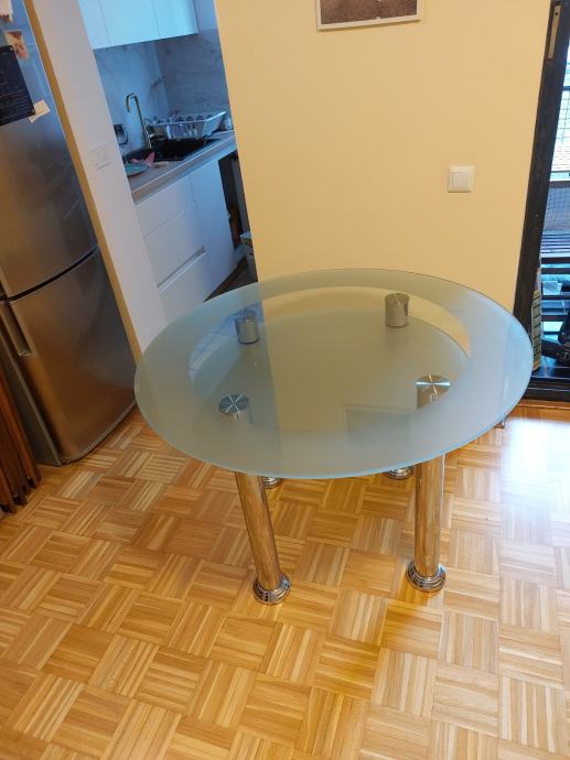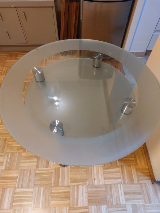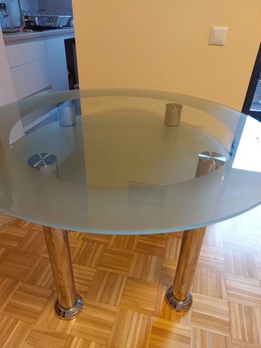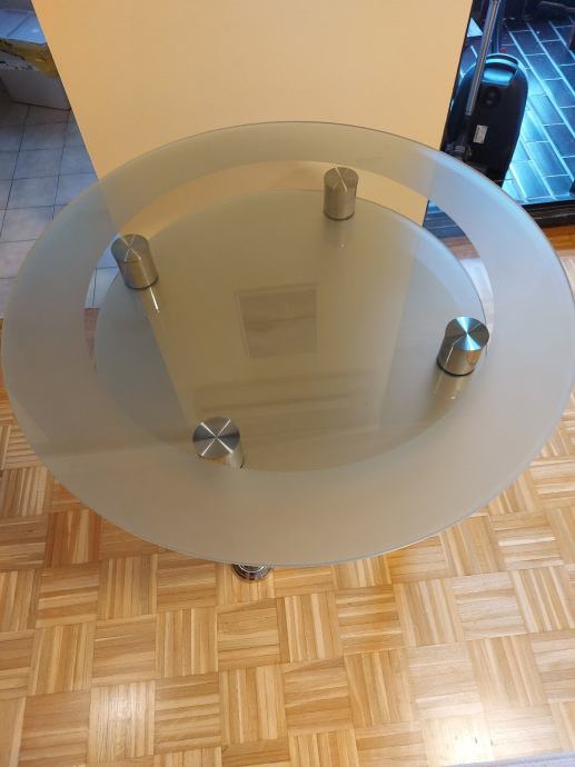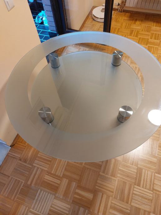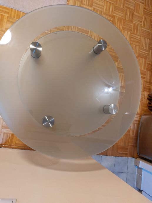 Prodajem elegantan okrugli stakleni stol promjera 110 cm i visine cca 75 cm. Stol ima čvrstu metalnu konstrukciju i debelo kaljeno staklo, idealan je za blagovaonicu, dnevni boravak ili uredski prostor.