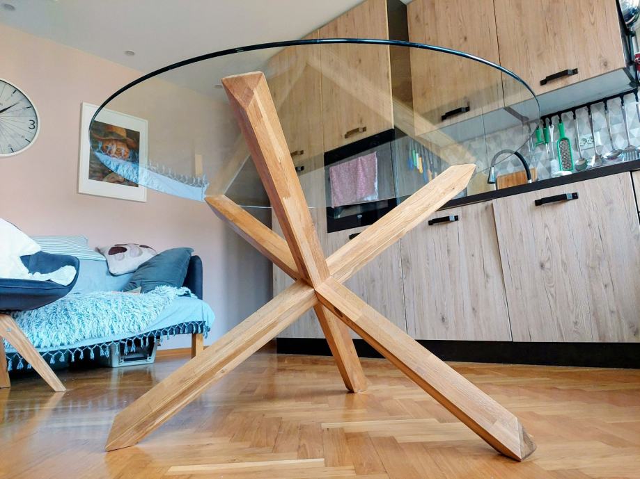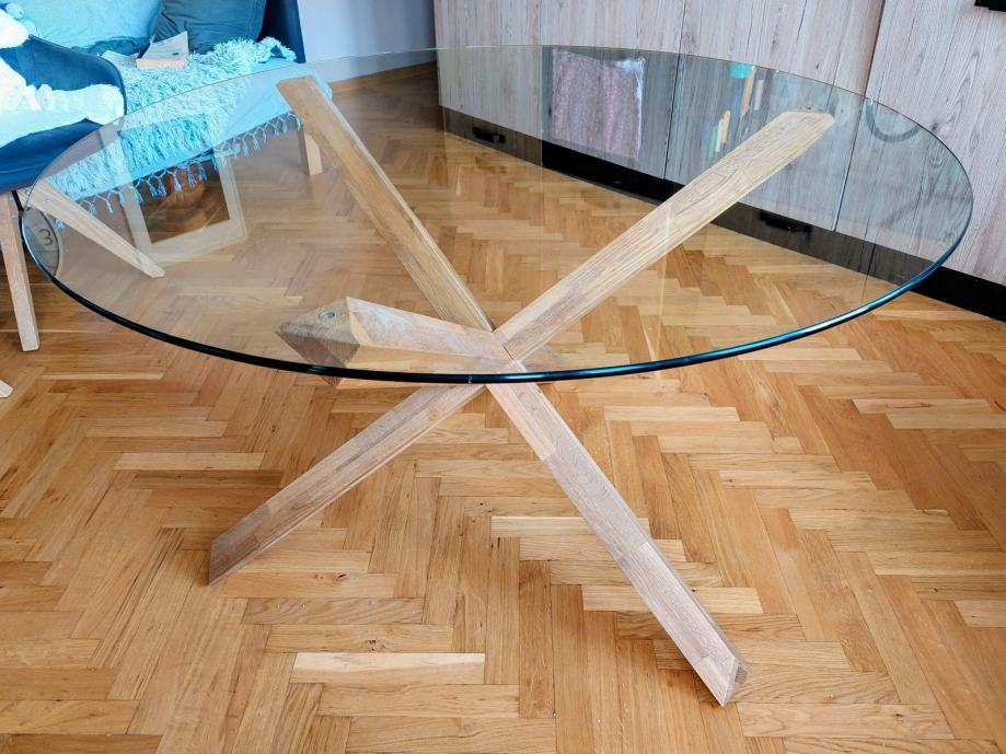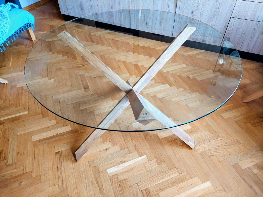 Prodajem blagovaonski okrugli stol: Agerby (Jysk), noge puno drvo hrast, ploča stola staklo promjera 120 cm.