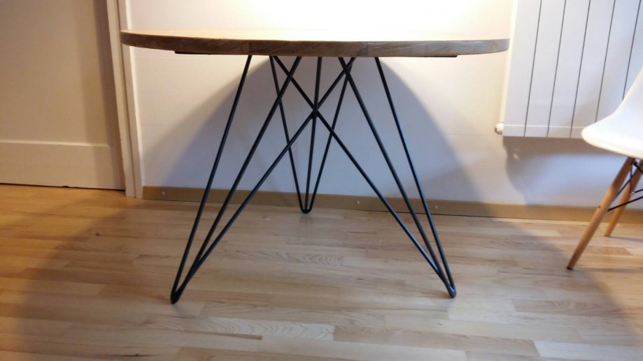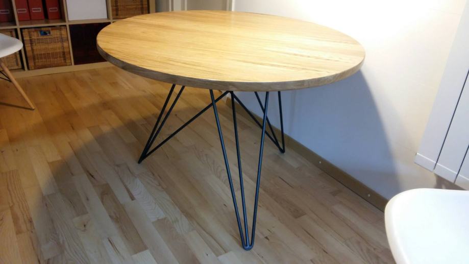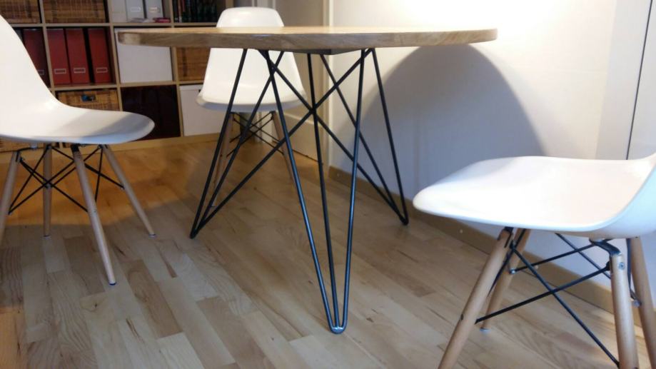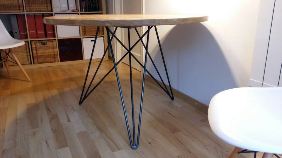 Okrugli blagavaonski stol, ploca od masivnog hrasta, promjera 105 cm, hairpin noge, celicne grafitno sive (gotovo crne), u savrsenom stanju, bez ogrebotina ili ostecenja.