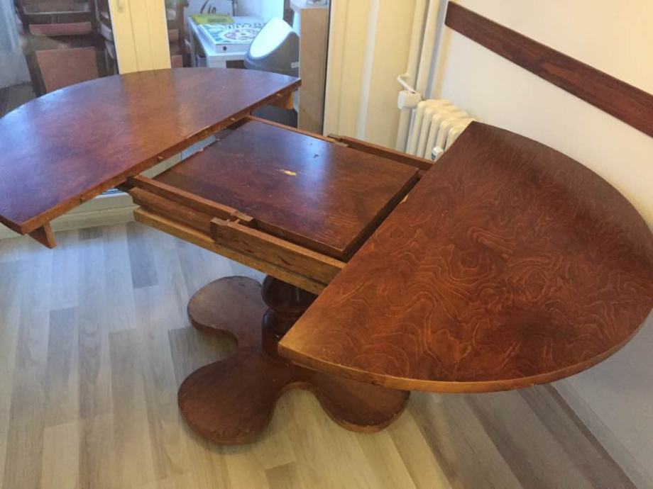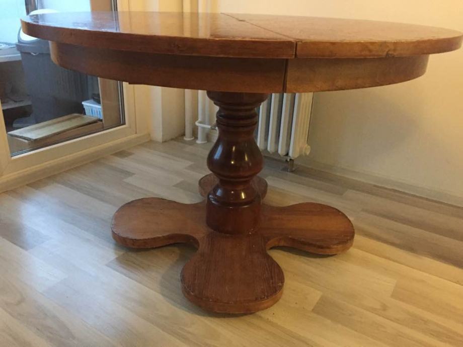 Stari masivni okrugi stol na razvlačenje,promjera 120(160)cm. Stol je malo oštećen što se vidi na slikama.Cijena nije fiksna.