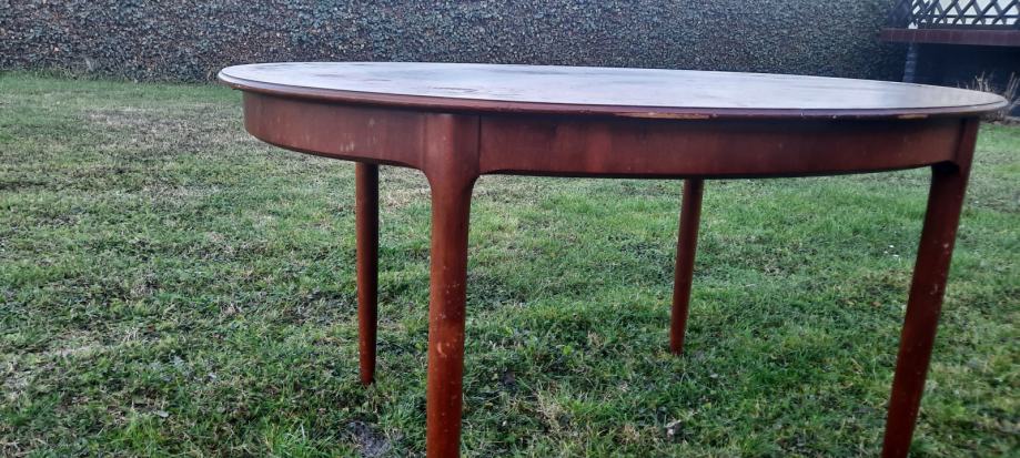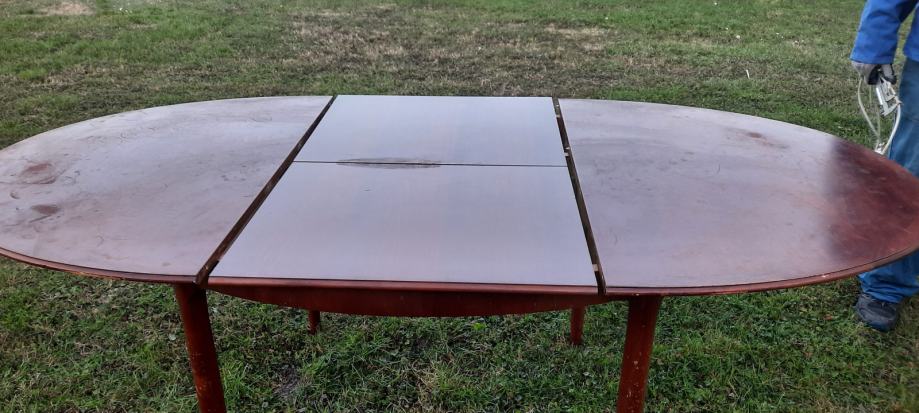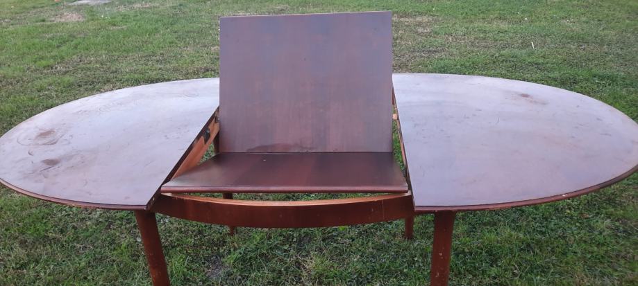 Blagovaonski drveni stol na razvlačenje boje lješnjaka. Korišten ali potpuno stabilan, za 4-8 osoba. Visina 75 cm, dužina 136/196cm, širina 96 cm.