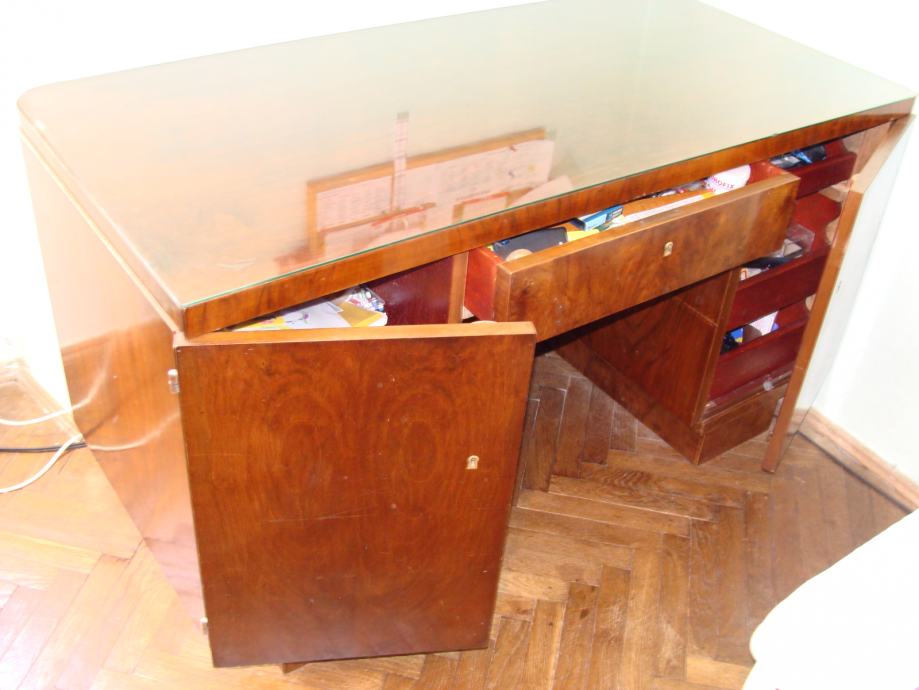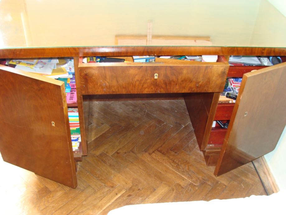 Prodajem starinski pisaći stol od punog drveta, orahov furnir, dimenzija 145x71 cm visine 80 cm. Osim uobičajenih polica i ladica, sa prednje strane nalazi se ostakljena polica. U jako dobrom stanju.