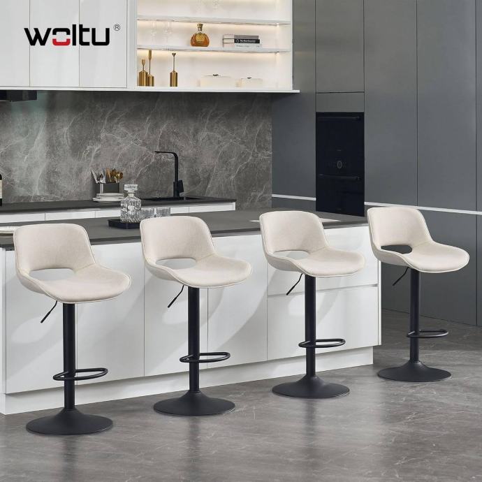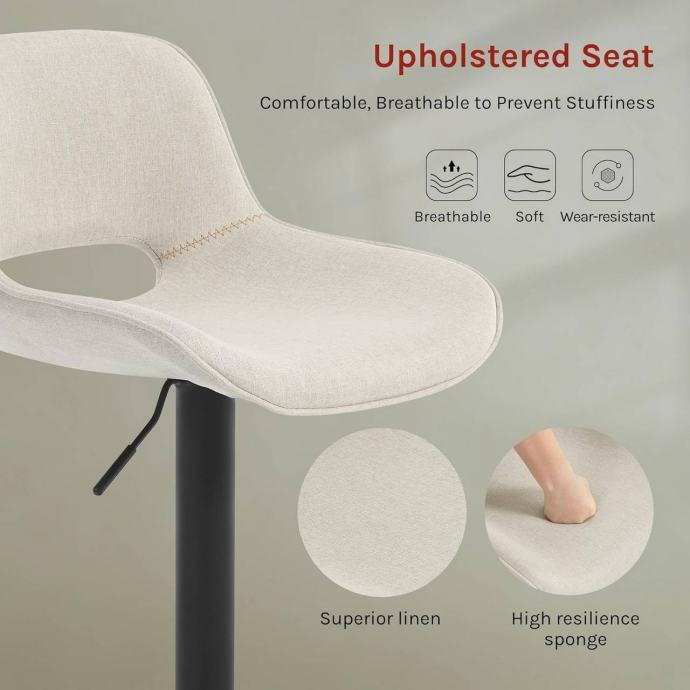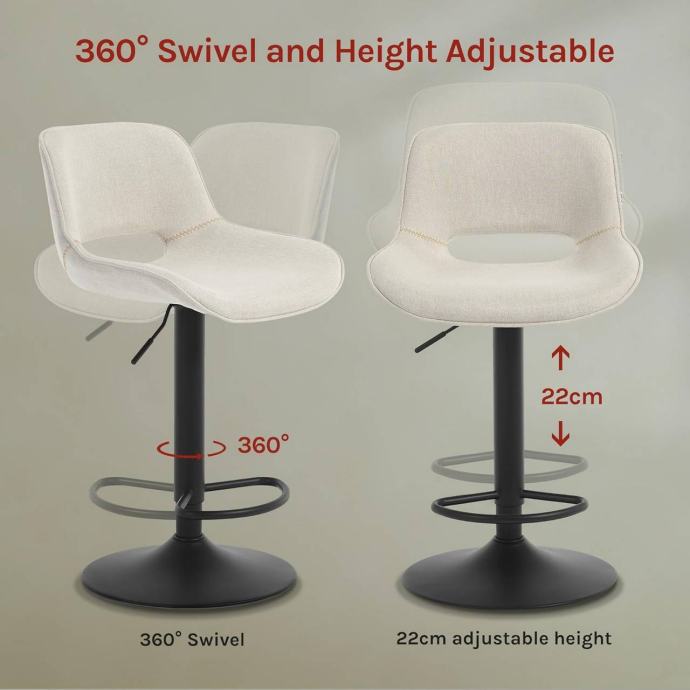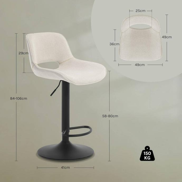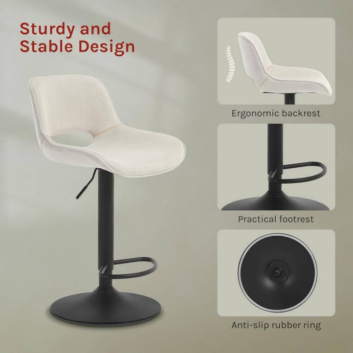 Visina sjedišta može se podesiti između 58 i 80 cm, što stolici omogućuje korištenje uz različite šankove i visoke stolove. Elegantna i jednostavna forma te lanena presvlaka uklapaju se u moderne interijere, dok priložene upute za montažu olakšavaju sastavljanje.