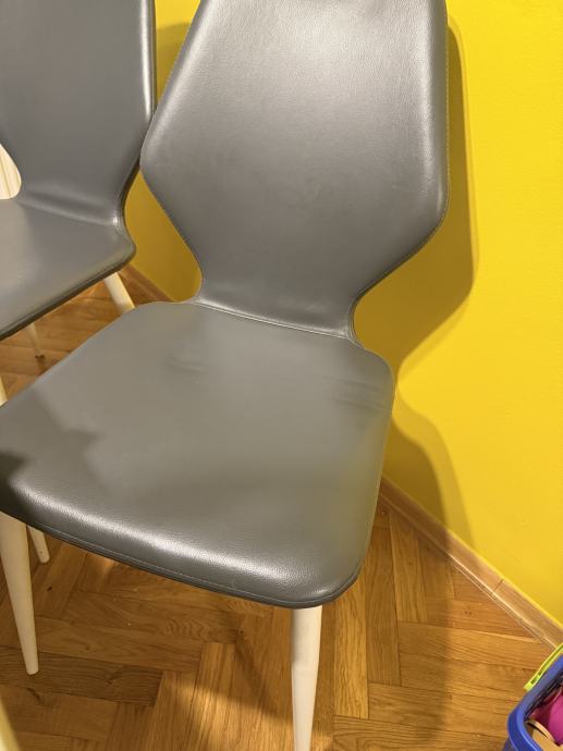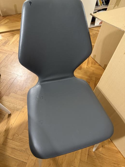 Poklanjam komplet 6 stolica za blagavaonu. Siva boja, umjetna koza, bijele metalne noge. Stolice su u dobrom stanju, na par mjesta je koza oguljena. Potrebno doci po stolice i iznijeti ih iz stana.