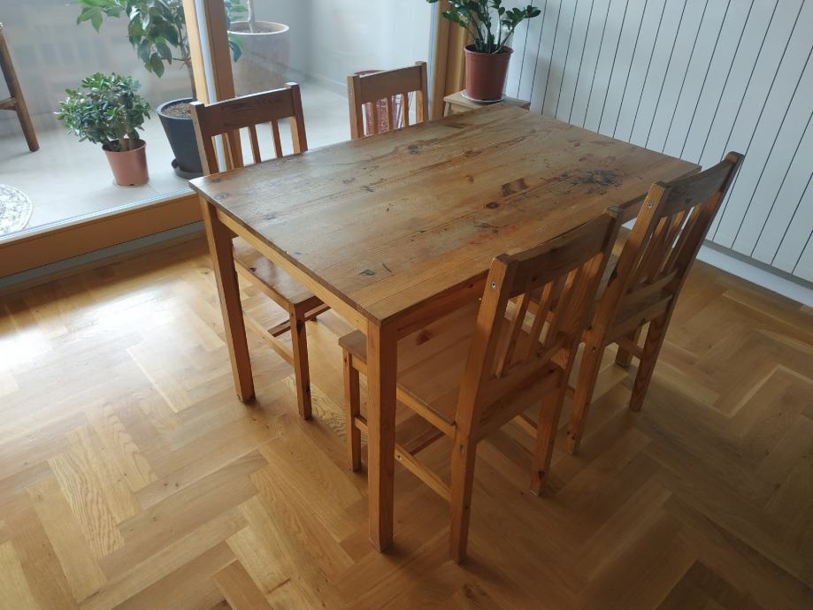 Rabljeni, ali funkcionalni set stola i 4 stolice od borovine
