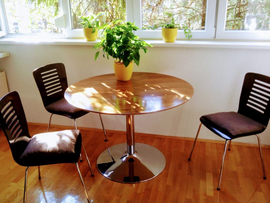Veliki smeđi okrugli stol promjera 110cm i 3 smeđe stolice u kompletu sa stolom.