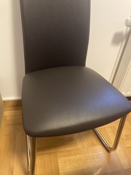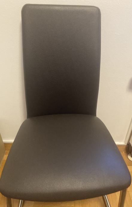 Stolice su tamno smeđe boje, sa metalnim nogama.