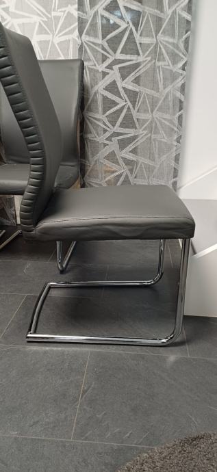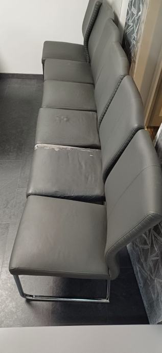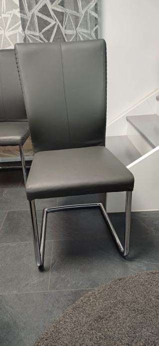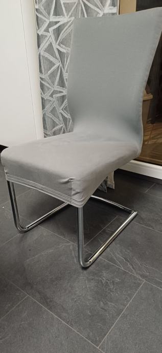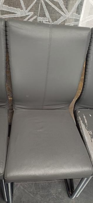 Prodajem rabljene stolce. Boja: siva, širina/visina/dubina: 44,5/99/63 cm. Izrazito su udobni, ali materijal je ekokoža pa su pojedini stolci oštećeni i potrebno ih je pretapicirati. Uz njih dajem i sive elastične navlake. Ukupno ima 6 stolaca, a cijena za sve je 200 eura.