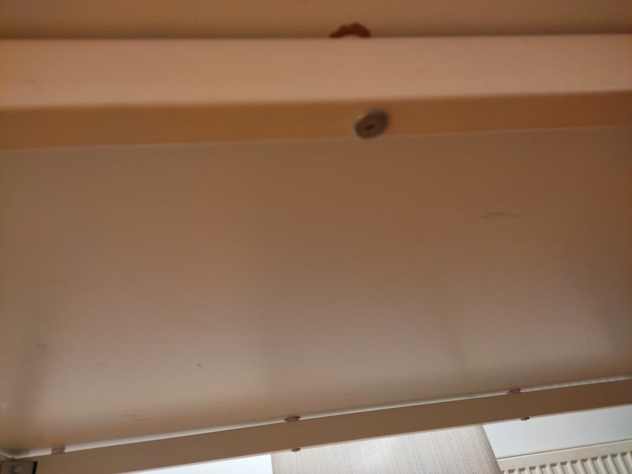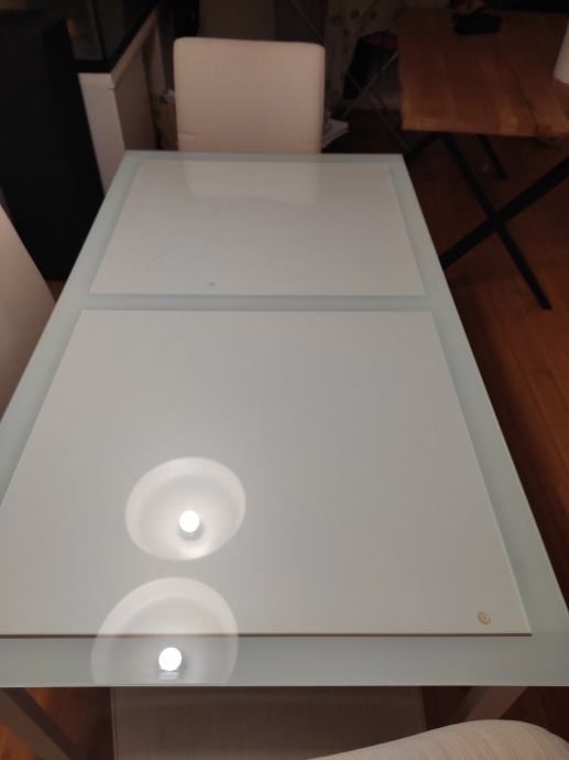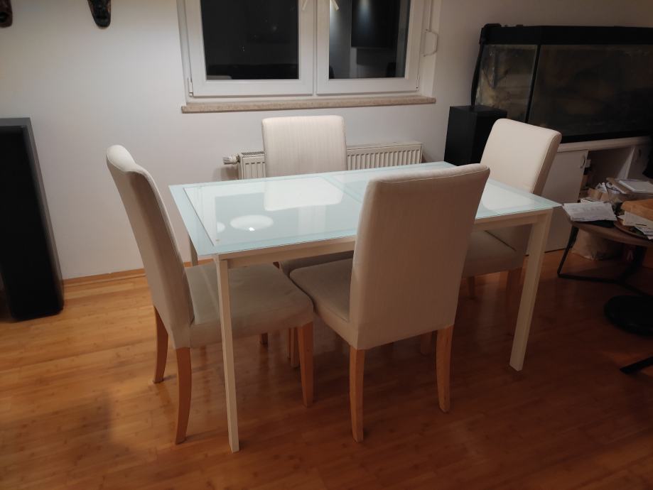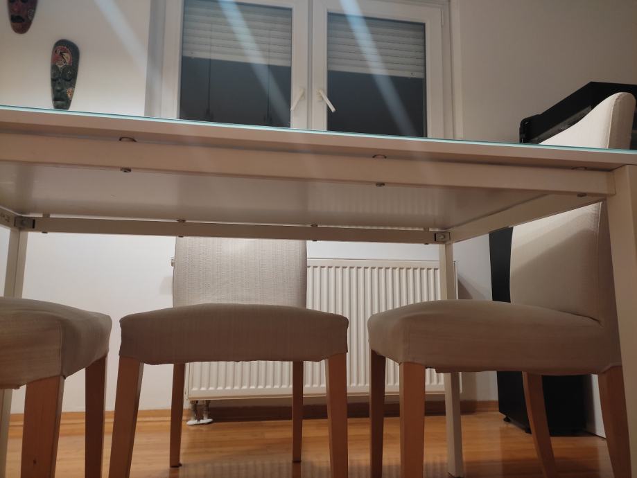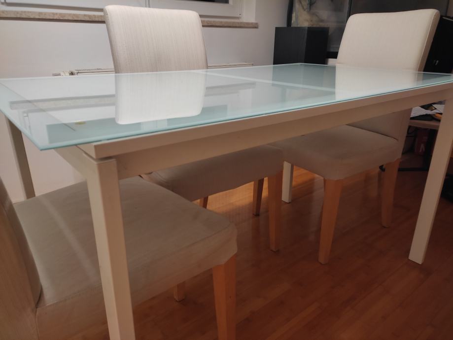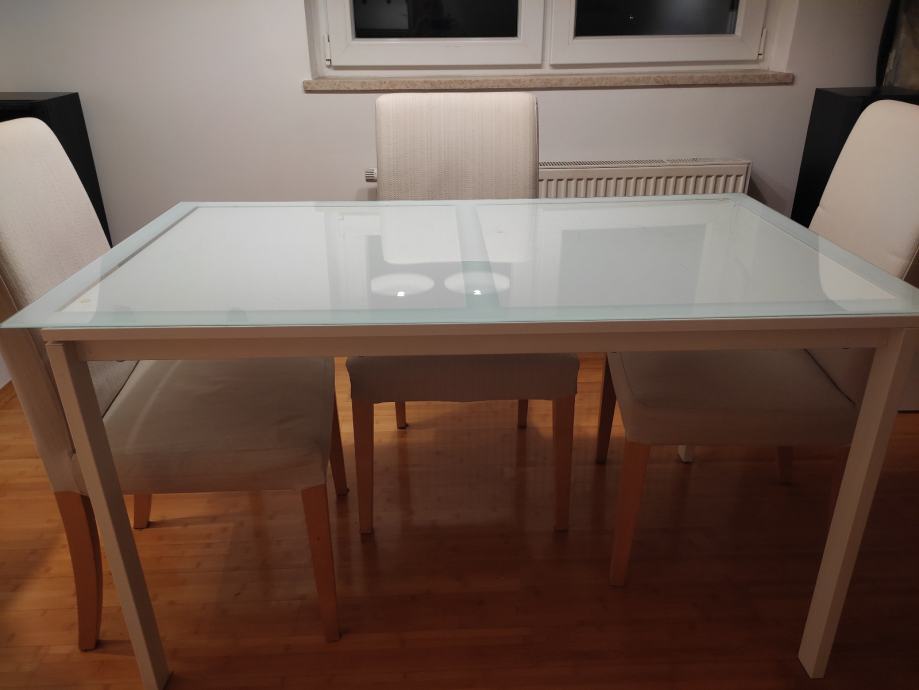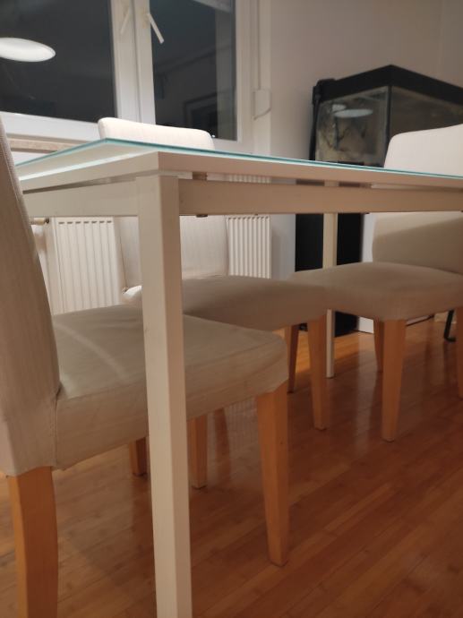 Stol je dimenzija 125 cm dužina, 75 cm visina, 75 cm širina. Na njemu je kvarcno prozirno bijelo staklo koje se može maknuti dimenzija 135 cm dužine * 75 cm širine, debljina 6 milimetara. Postolje noge - metal bijela boja. Gornja ploha drvena - bijela boja. Cijena 60 eur. Sve IKEA !