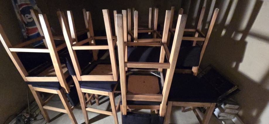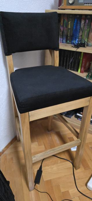 Prodajem visoke barske stolice od masivnog drveta s tapeciranim crnim sjedištem i naslonom. Stabilne, čvrste i vrlo udobne – savršene za rustikalni lokal, pub, restoran, konobu ili kućni bar.