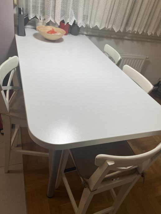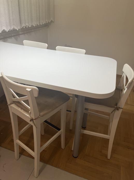Prodajem visoki stol, dimenzije: dužina: 176 cm, širina: 86 cm, visina: 98 cm. Može se montirati na zid u kuhinji, blagovaoni, ima dvije noge, idealan je za visoke stolice sa sjedištem na 63 cm. Noge od stola, kao i dimenzija samog stola se mogu skratiti, tj. dodati još dvije i napraviti visinu stola po želji. Super očuvan, težak i masivan.