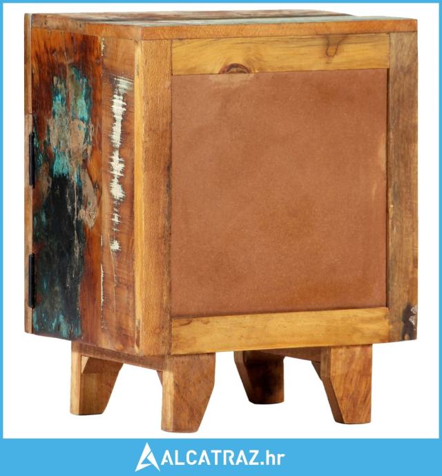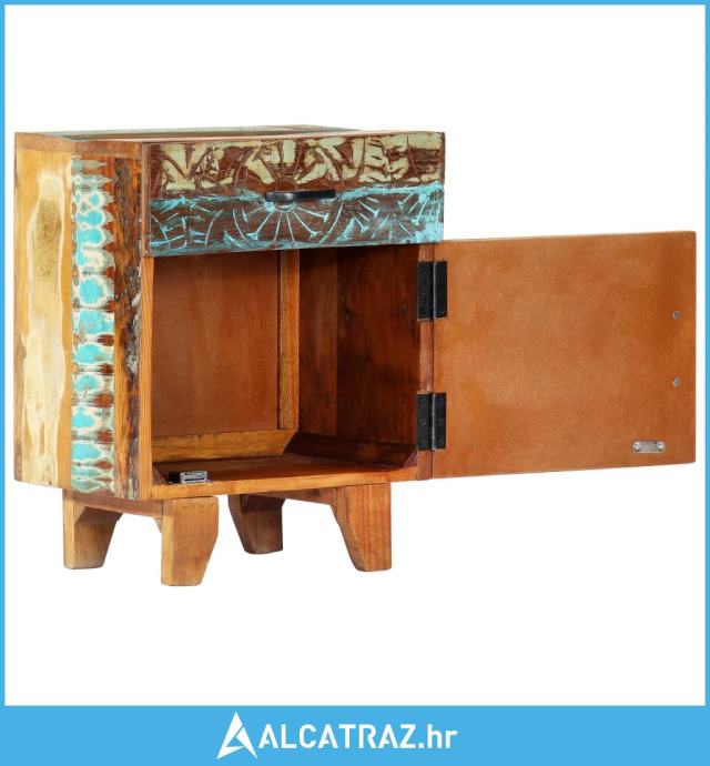 Ovaj šareni noćni ormarić s antiknim ručno izrezbarenim uzorkom napravljen je od masivnog obnovljenog drva dobivenog od greda, podova i potpornih greda iz starih zgrada koje su se rušile i može se sastojati od različitih vrsta drva poput bora, tika, bukve, hrasta, cedra, drva manga, bagrema itd. To znači da obnovljeno drvo zadržava karakteristike tih različitih vrsta drva. Obnovljeno drvo već je ostarjelo, istrošeno vremenom i osušeno, tako da se ne skuplja i ne savija. Svaki korak procesa izveden je s najvećom pažnjom, bilo da se radi o bojenju, poliranju ili lakiranju. Izvrsna izrada i otmjeni drveni godovi čine svaki komad namještaja prepoznatljivim i pomalo drukčijim od sljedećeg. Uz to, ovaj starinski noćni ormarić ima 1 ladicu i 1 vrata, što nudi idealno rješenje za držanje manjih predmeta organiziranima i na dohvat ruke. Ormarić za pohranu jednostavno se sastavlja.