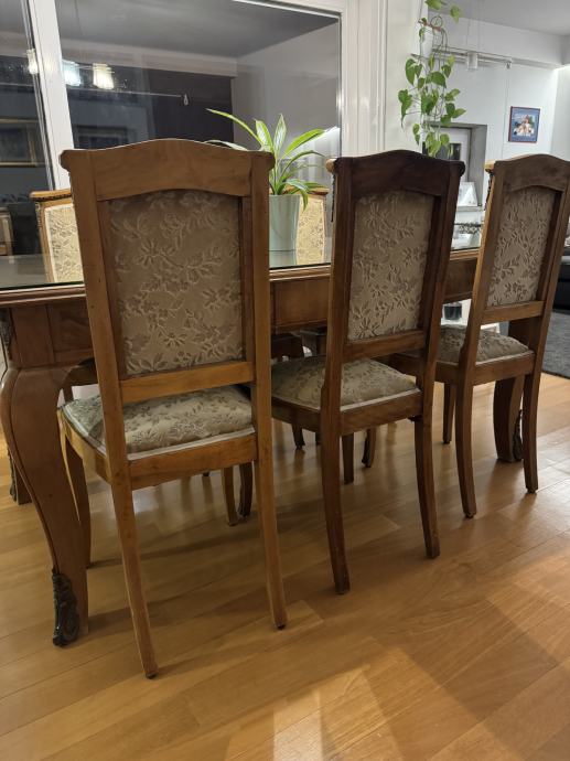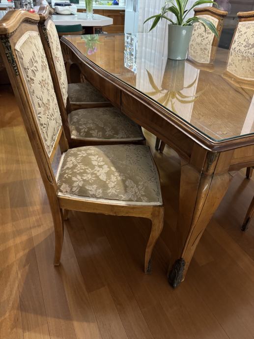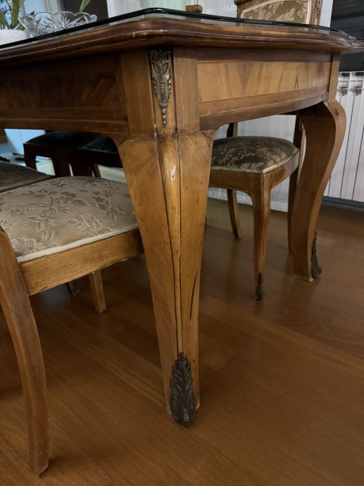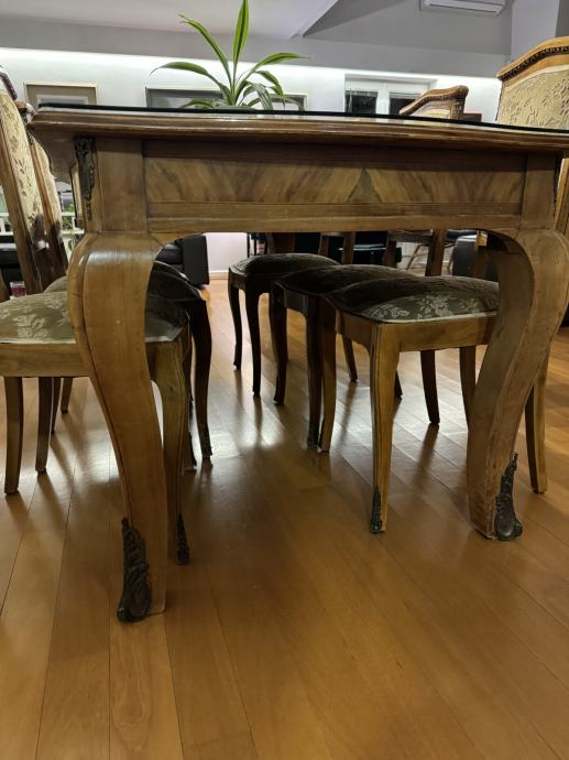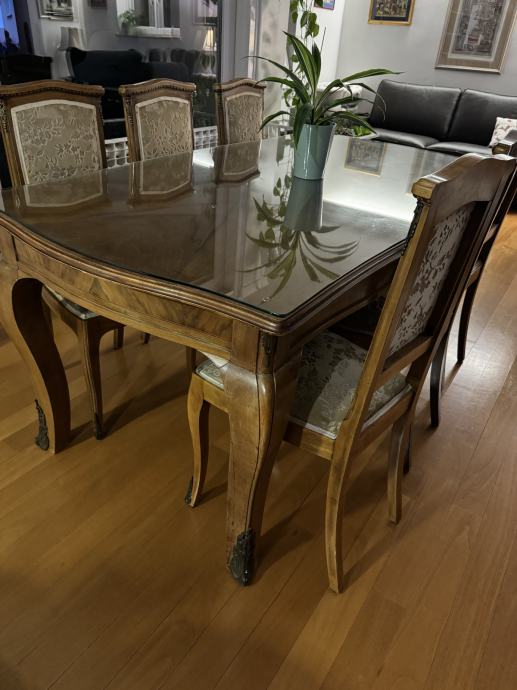 Prodajem orahov stilski stol i 6 tapeciranih stolica sa mesinganim ornamentima, u stilu Lui XV. Stol ima staklenu zaštitu. Sve je u odličnom stanju.