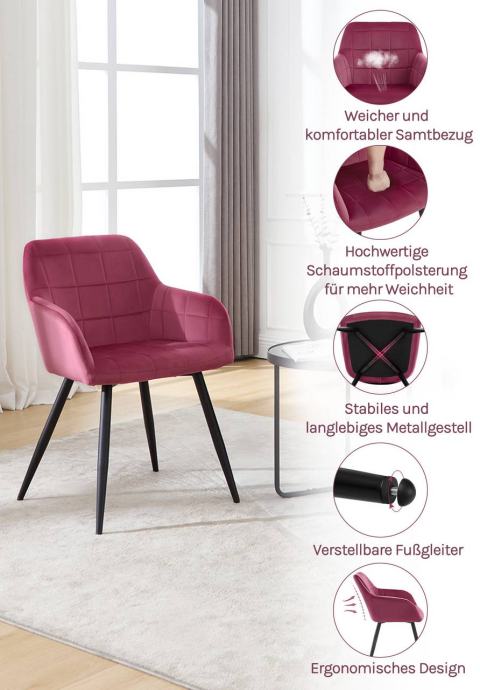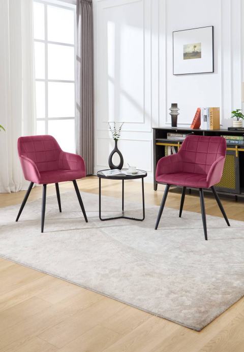 Elegantan set od dvije blagovaonske stolice pruža udobnost, stabilnost i moderan izgled koji se lako uklapa u svaki interijer. Mekano baršunasto sjedalo ispunjeno kvalitetnom pjenom, uz zakrivljeni naslon i integrirane naslone za ruke, nudi iznimno udobno i ergonomsko sjedenje. Površina je glatka, nježna na dodir i vrlo ugodna za duže korištenje.
