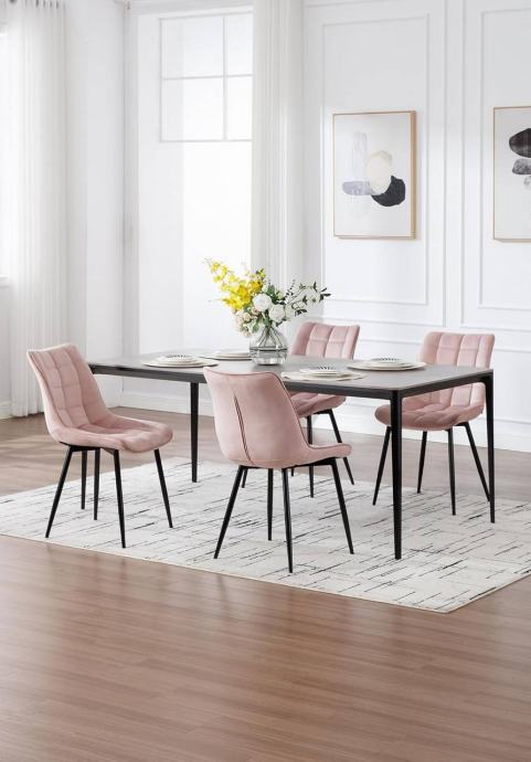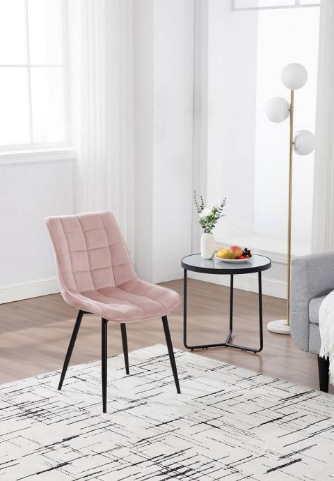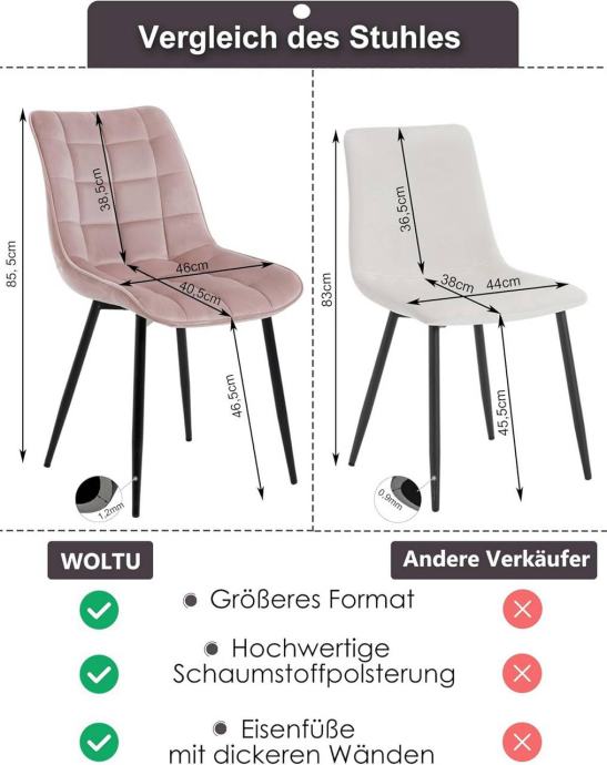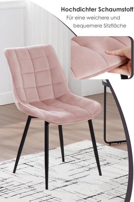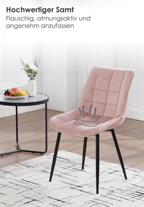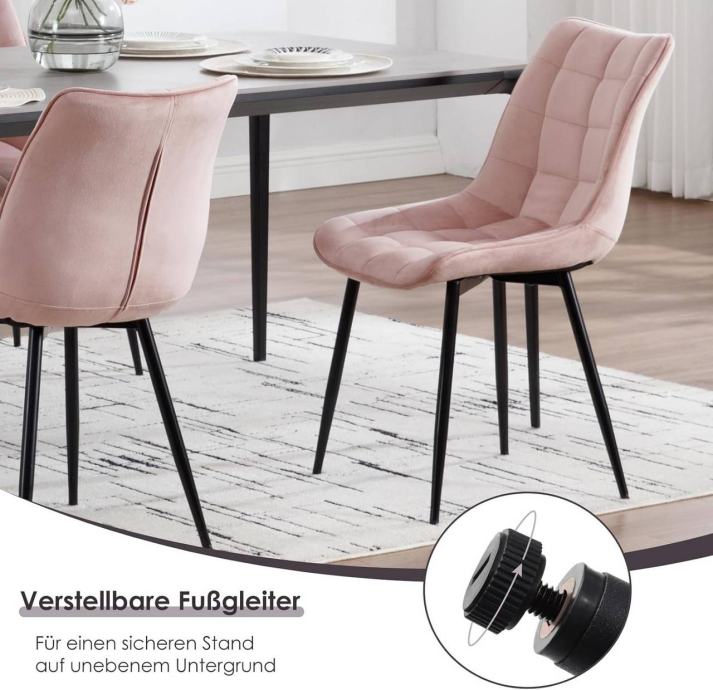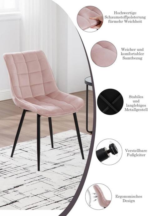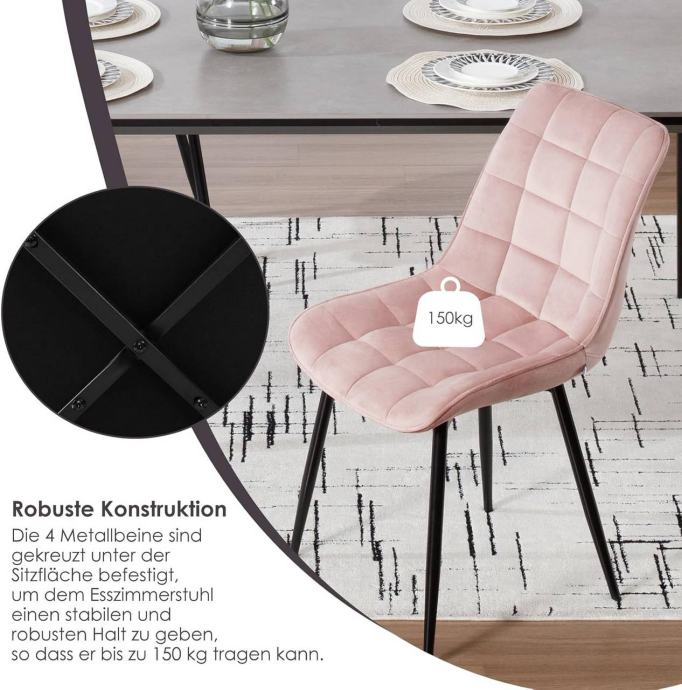 Stolice su tapecirane izdržljivim baršunom, potpuno ispunjene visokogustoćnom spužvom i podržane čvrstim metalnim nogama, što ih čini stabilnima i dugotrajnima s nosivošću do 265 lbs. Stolice su ergonomski oblikovane s naslonom i zakrivljenim rubovima sjedala, udobne i prozračne za opušteno sjedenje. Dizajn je jednostavan i moderan, pogodan za blagovaonice, kuhinje, urede, spavaće sobe, dnevne sobe, balkone ili prostorije za prijem gostiju. Sve noge imaju podloške protiv klizanja koje štite pod i povećavaju stabilnost. Stolice se jednostavno sklapaju prema uputama s jasno označenim dijelovima.