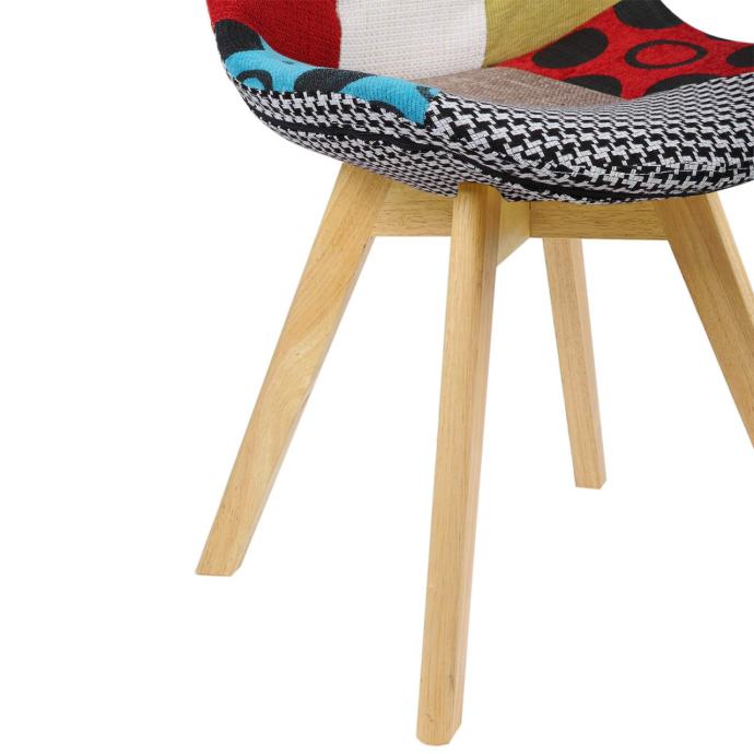 Ove stolice imaju zakrivljeni naslon koji ergonomski podupire leđa, a sjedalo ispunjeno pjenom visoke gustoće pruža udobnost i smanjuje zamor. Presvlaka od patchwork lana omogućava prozračnost. Sjedalo od izdržljivog PP-a tapecirano je lanom, a noge od masivnog drva postavljene su ukriženo ispod sjedala, što osigurava stabilnost i nosivost do 120 kg. Sve noge imaju protuklizne podloge koje štite pod od ogrebotina i smanjuju buku pri pomicanju. Stolice kombiniraju nordijski i rustikalni stil i pogodne su za blagovaonicu, dnevni boravak, radni prostor ili spavaću sobu. Jednostavno se sastavljaju pomoću priloženih uputa i dijelova.