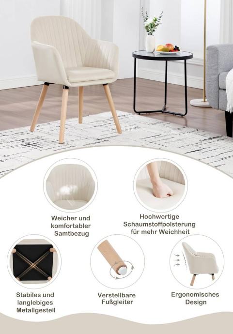 Stolice su presvučene izdržljivim baršunom, imaju stabilnu metalnu bazu i čvrste drvene noge. Protuklizne podloške na nogama štite pod i smanjuju buku pri pomicanju. Moderan dizajn s linijskim uzorkom čini ih idealnima za blagovaonicu, dnevni boravak, radni stol ili spavaću sobu.