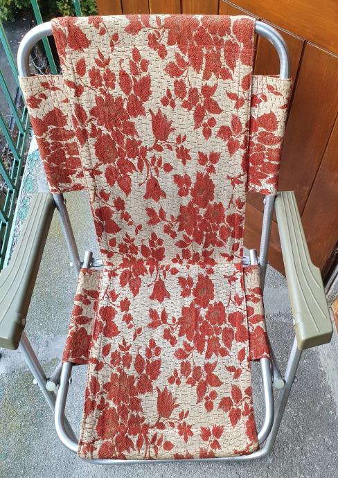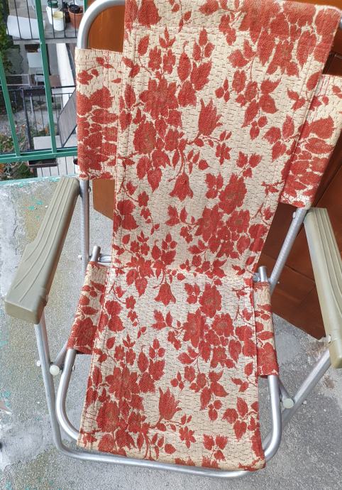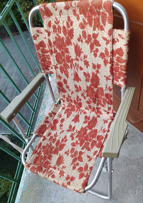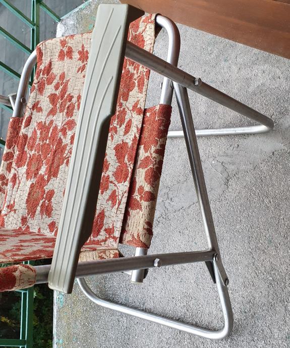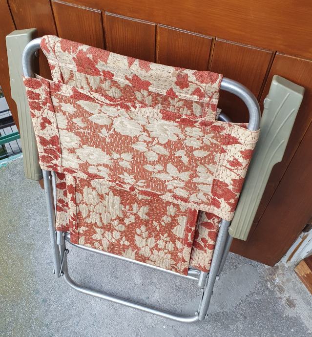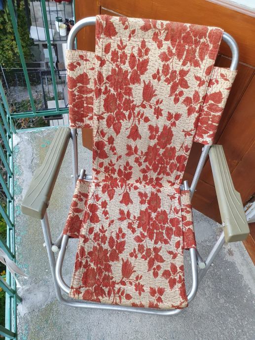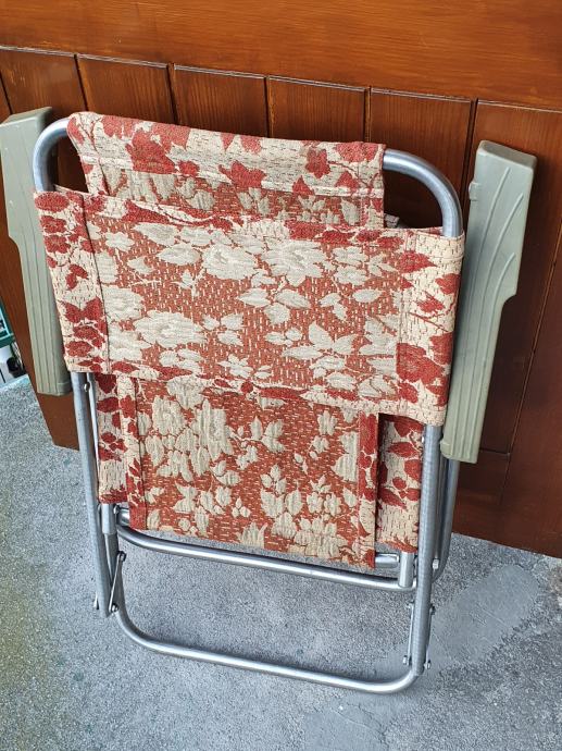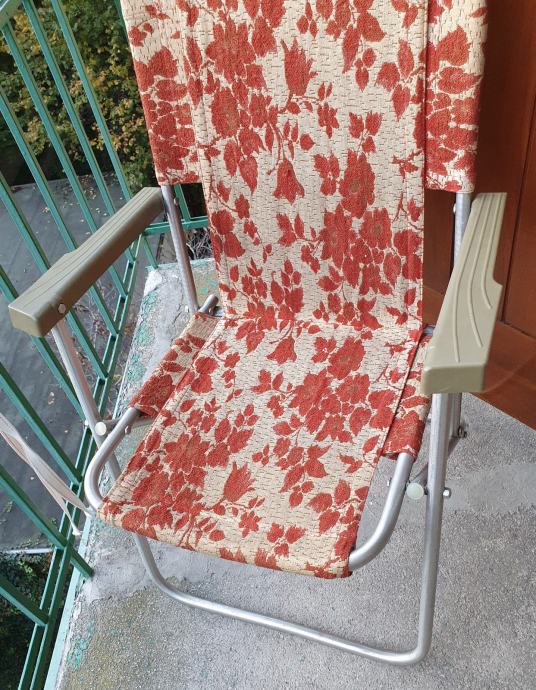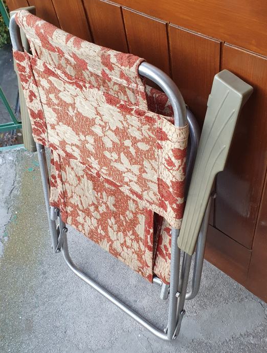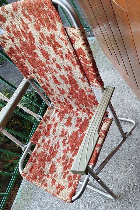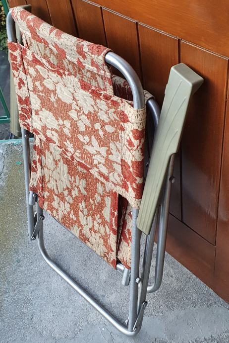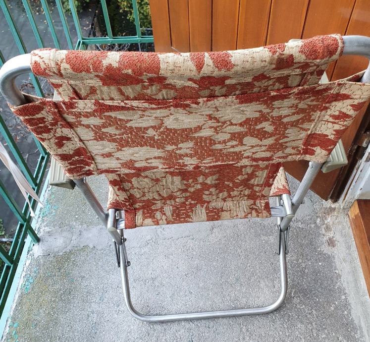 PRODAJEM SKLOPIVU STOLICU ROBUSNE IZVEDBE IZ ALUMINIJSKIH CIJEVI SVJETLE ŠIRINE IZMEĐU RUKOHVATA 47 cm, DUBINE 43 cm I VISINE NASLONA 55 cm.