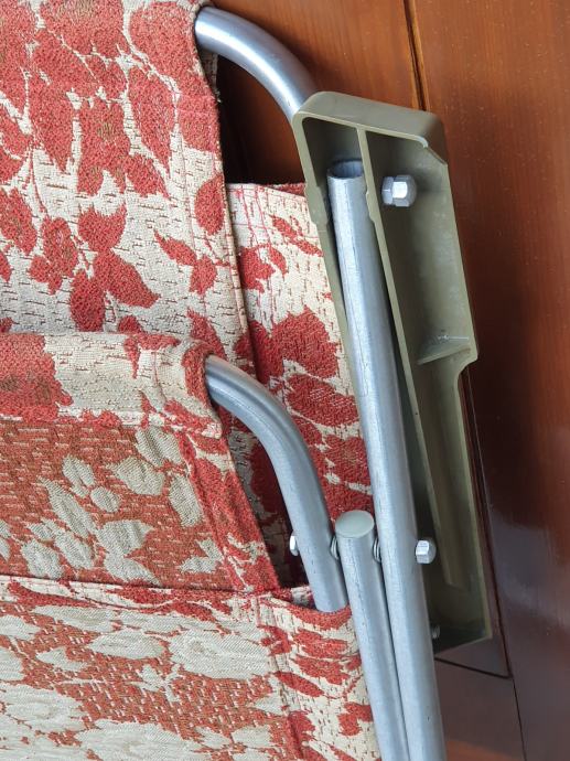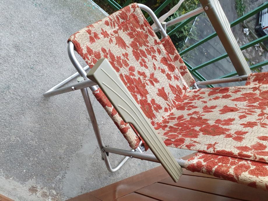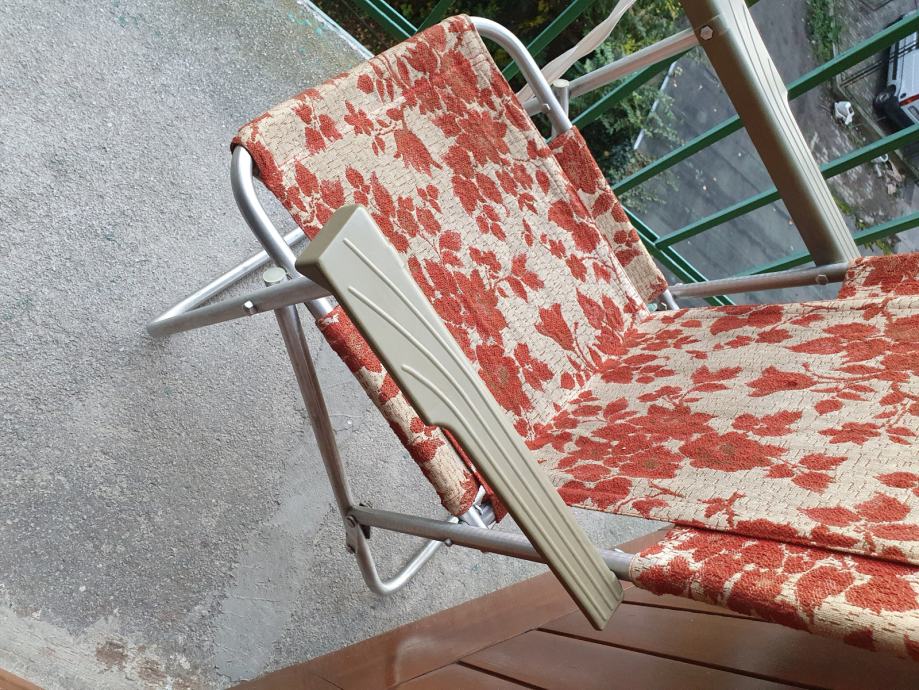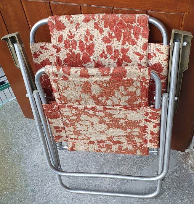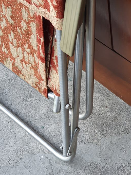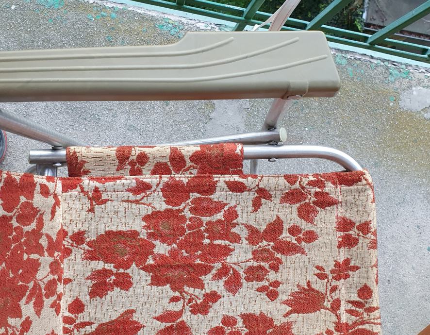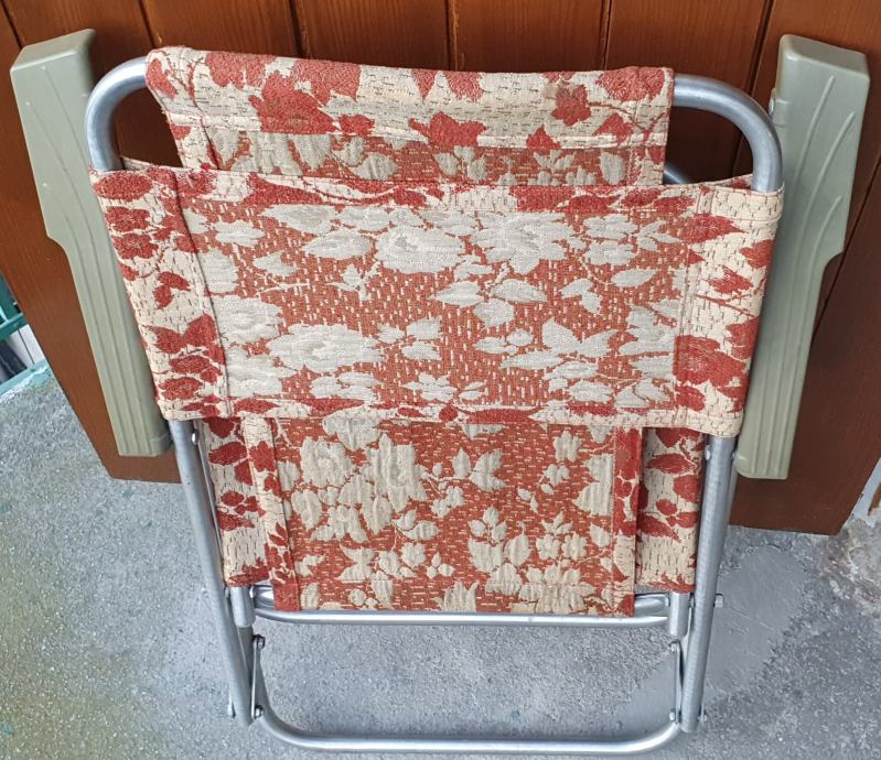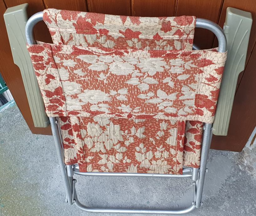 PRODAJEM SKLOPIVU STOLICU ROBUSNE IZVEDBE IZ ALUMINIJSKIH CIJEVI SVJETLE ŠIRINE IZMEĐU RUKOHVATA 47 cm, DUBINE 43 cm I VISINE NASLONA 55 cm.