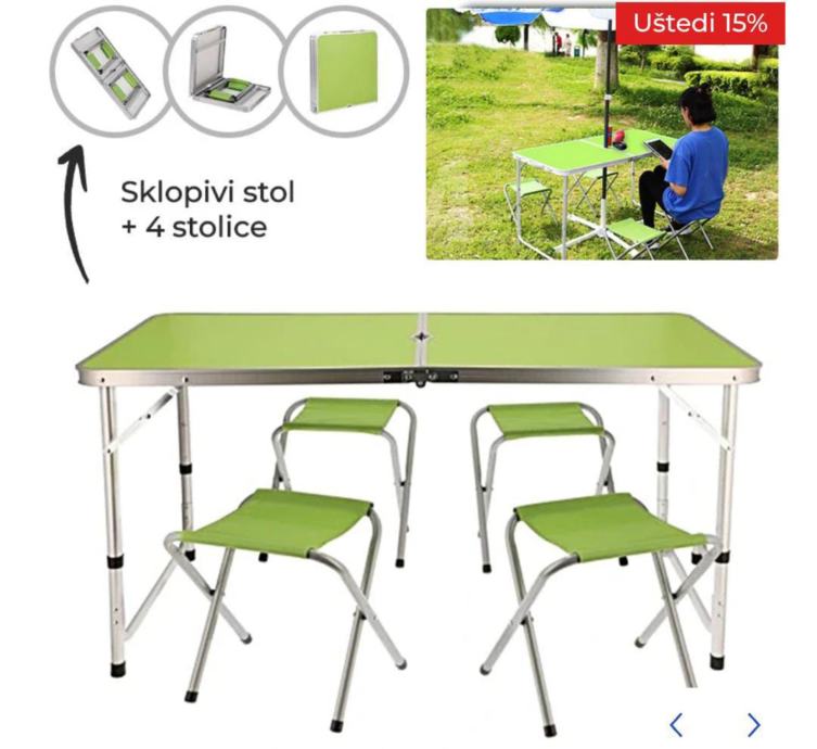 Praktičan set za aktivnosti na otvorenom koji kombinira funkcionalnost, stabilnost i jednostavno sklapanje. Idealan za kampiranje, piknik, vrtna okupljanja i razne druge prigode. Uz sklopivi stol dimenzija 120 x 60 cm, u paketu dolaze i 4 sklopive stolice, što ovaj komplet čini potpunim rješenjem za druženje na otvorenom.