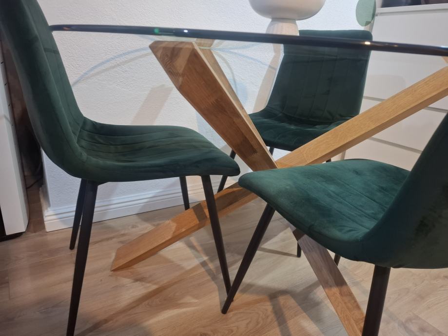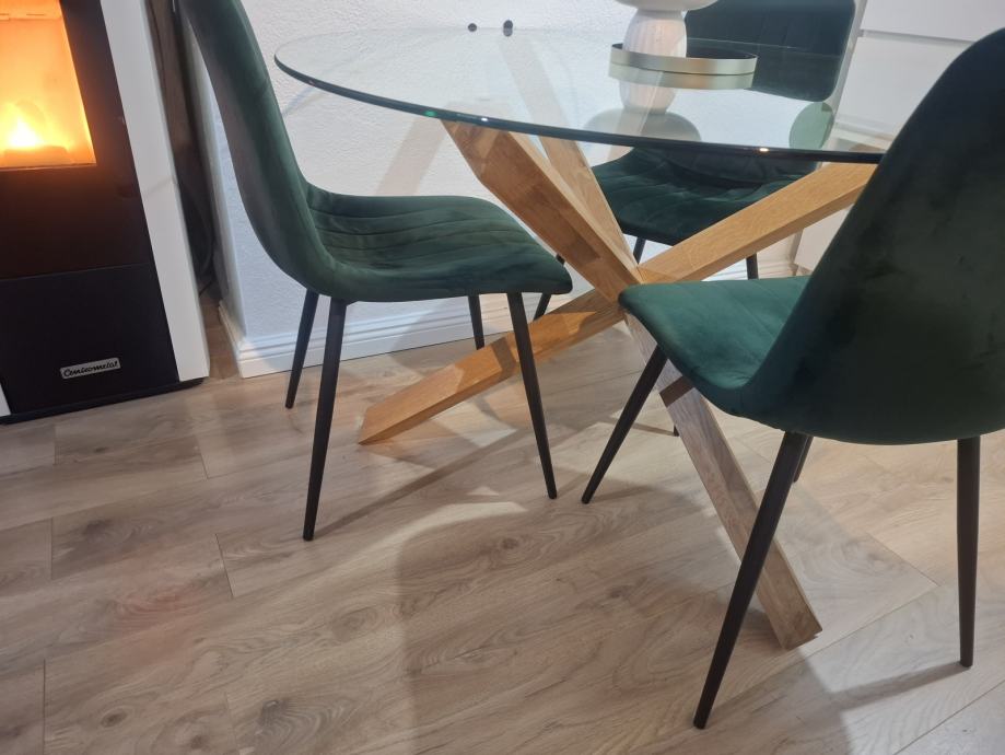 Na prodaju okrugli blagovaonski stol s gornjom pločom od kaljenog stakla i nogama od masivnog hrasta. Stol je star godinu dana. Drvo je tretirano uljem kako bi se zaštitilo i istaknula njegova prirodna boja. Ø119xV76 cm