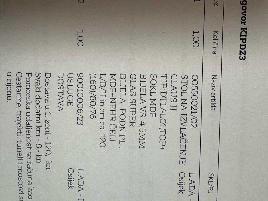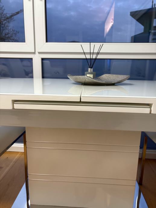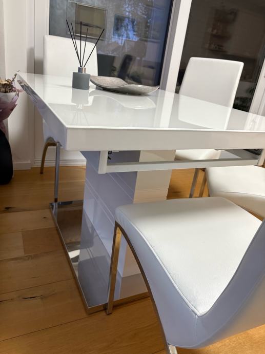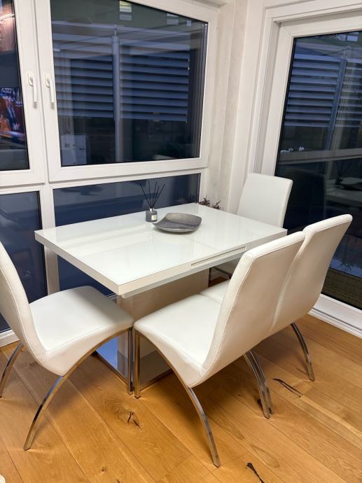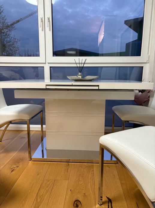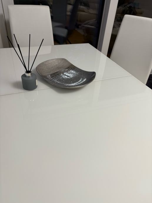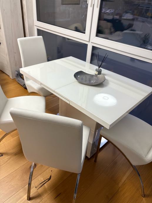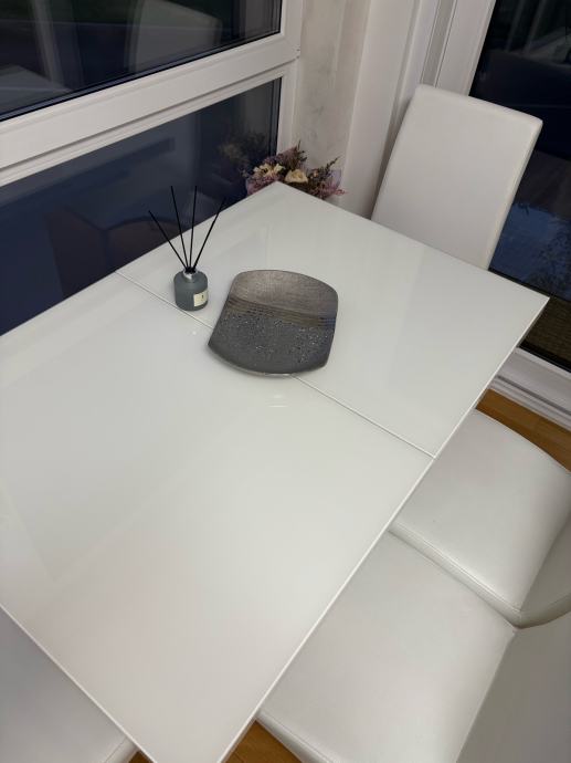 Bijeli stakleni stol na razvlačenje , bez ikakvih oštećenja, kratko korišten. Dimenzije 120( 160 kad se razvuče)/80/76.