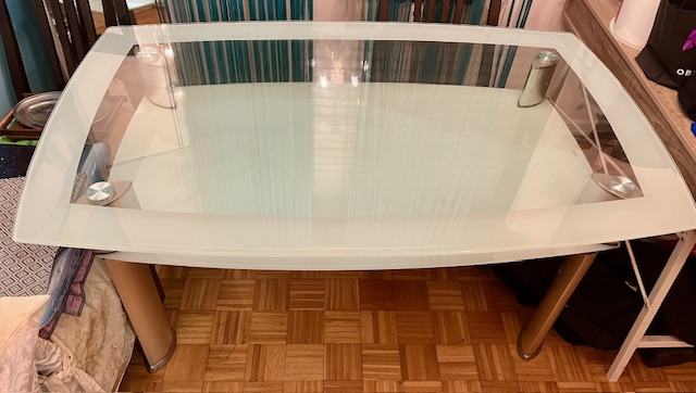 Očuvani stakleni stol s metalnim fleksibilnim rotirajućim nogama.