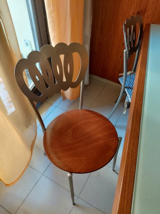 Uz stol dolaze stolice s metalnim okvirom i drvenim sjedalima u boji trešnje. Nasloni stolica imaju karakterističan dizajn s okruglim izrezima. U kompletu je 6 stolica.