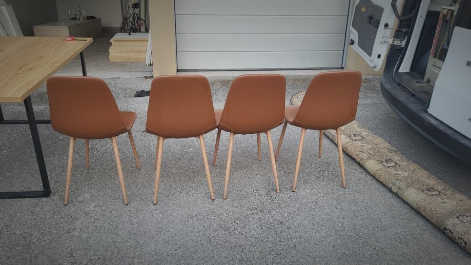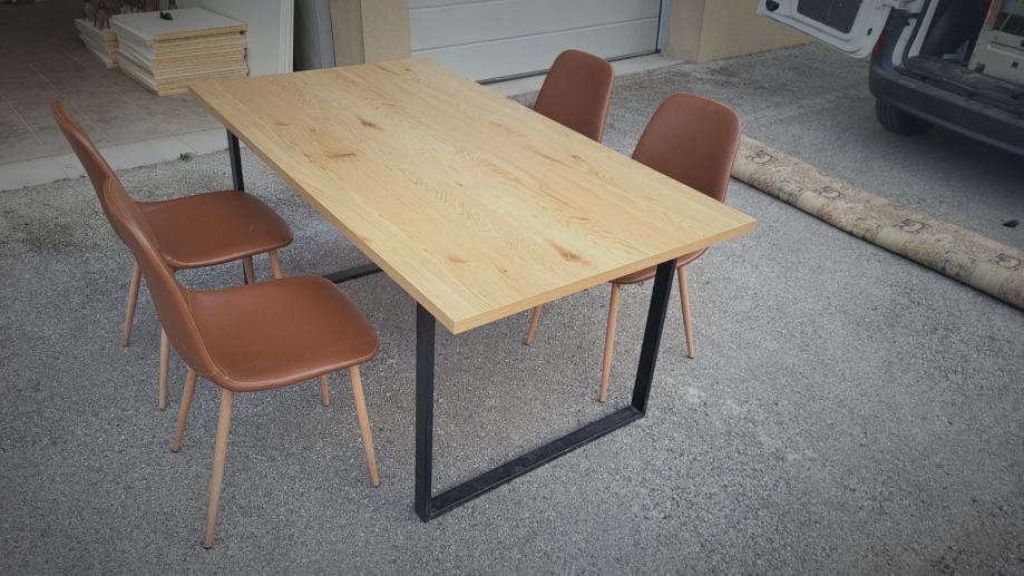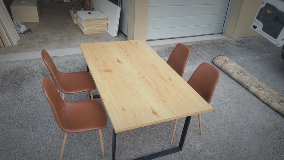Stol 160x90 (debljina 3cm) i 4 stolice, sve je u odličnom stanju osim što stol ima malo oštećenje od čika. Kvalitetno i čvrsto (metalne konstrukcije stola i stolica sa drvenim efektom). Novi Zagreb. Lako za prevesti jer su noge od stola skinute.