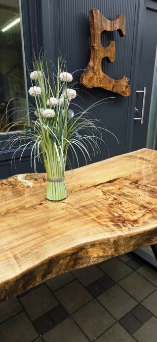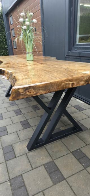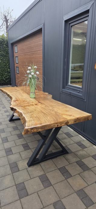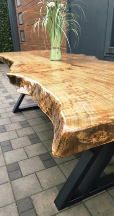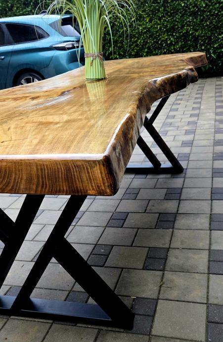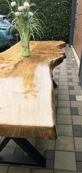 Stol dimenzija 250 x 9o cm i debljine daske čak 8 cm sa živim prirodnim rubovima. Rustikalno i elegantno u isto vrijeme pa pristaje i uz moderne kuhinje ali i rustikalne konobe, pečenjare, terase ili slično.