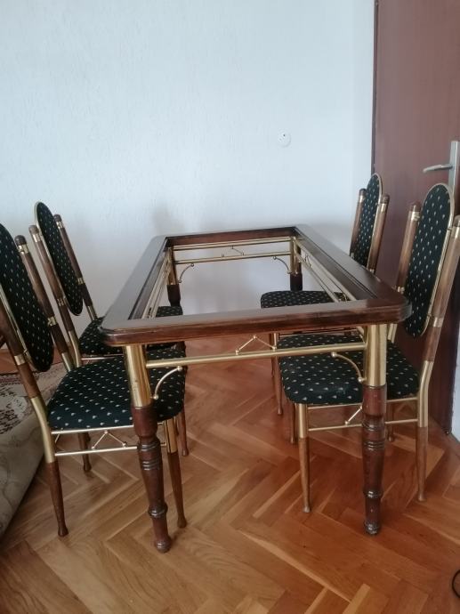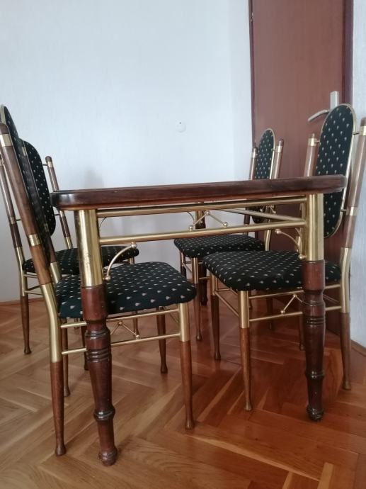 Stabilni stol i certiri stolice od masivnog drveta i mesinga.