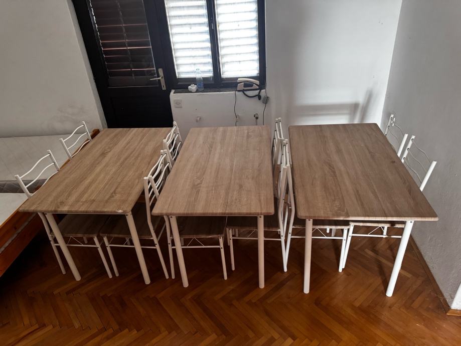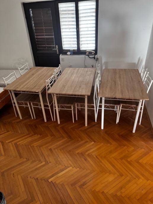 Prodajem 3 stola sa po 4 stolice,novo nekoristeno. 100 eur po setu. Imam 3 stola i 12 stolica sve isto. Dimenzije stola 120x70.