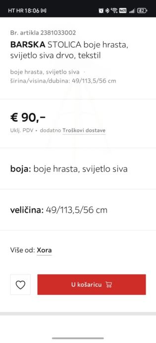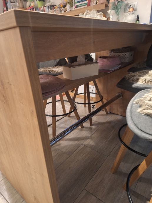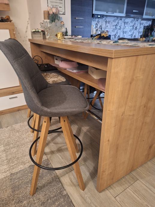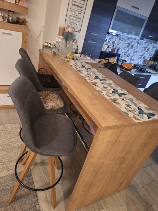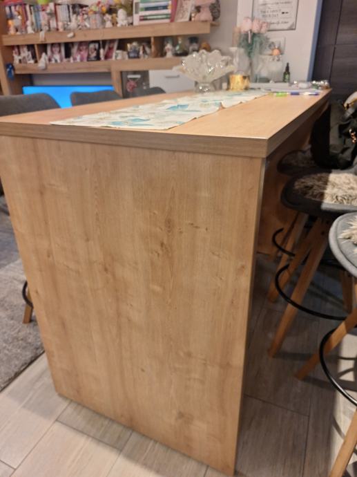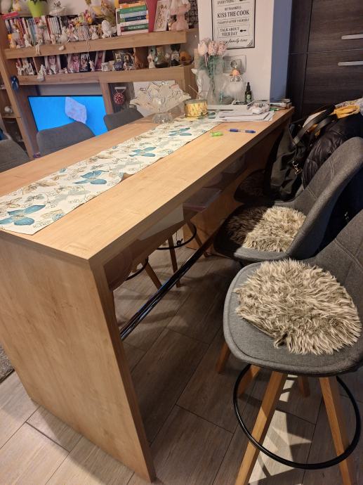 Prodajem visoki stol dimenzije 160x80x110 rađen po mjeri i 6 barskih stolica 49x113,5x65 kupljenih u Lesnini