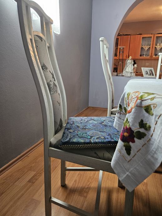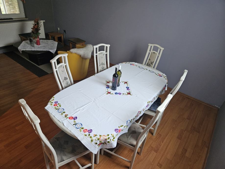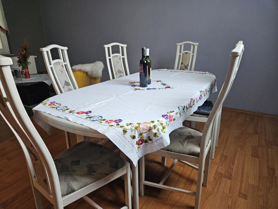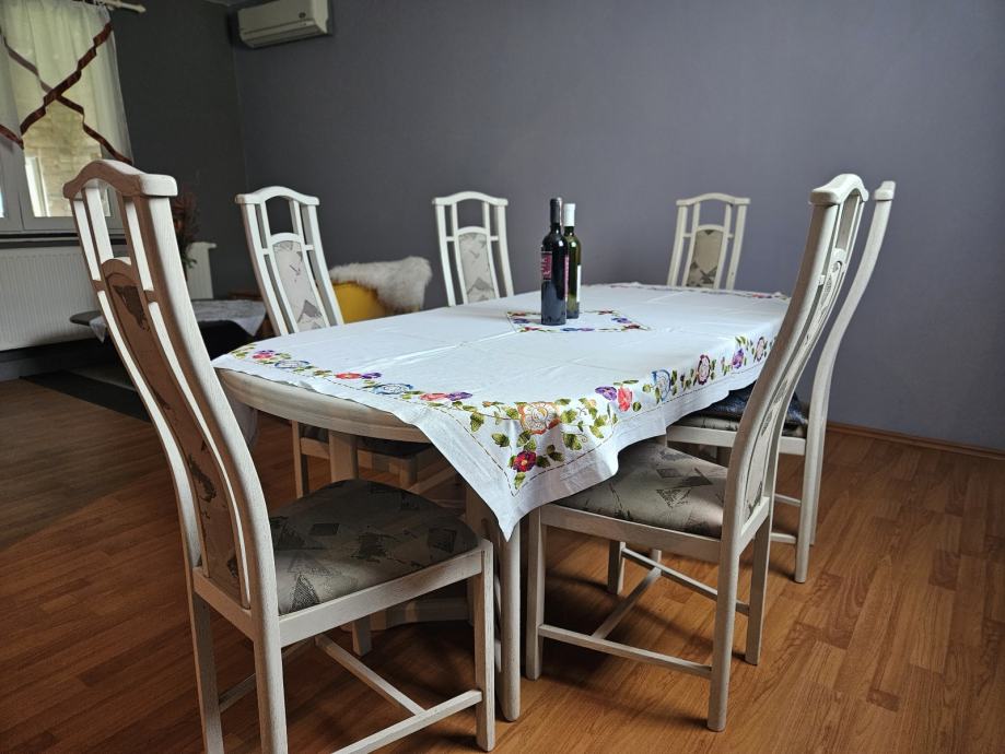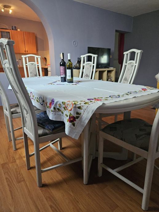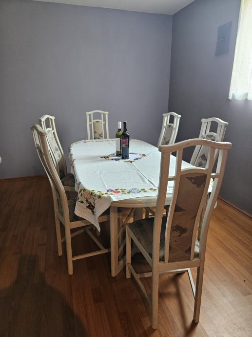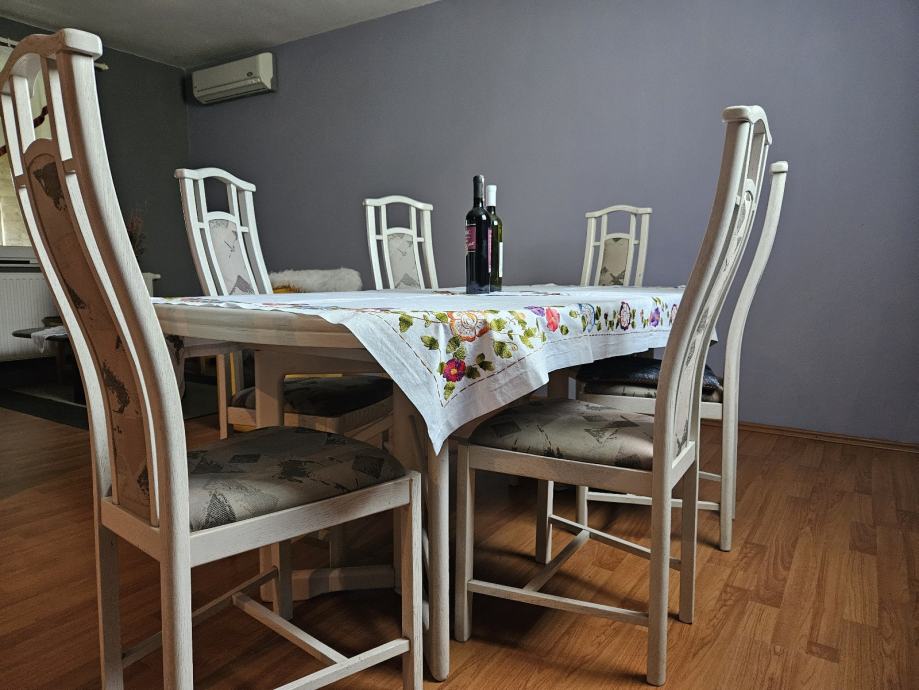 Prodajem blagovaonski stol s 6 stolica u bijeloj boji. Stol je ovalnog oblika, moze se razvući, za 10 - 12 osoba, a stolice imaju visoke naslone s ukrasnim detaljima te presvučena sjedišta. Kompletan set dolazi zajedno.