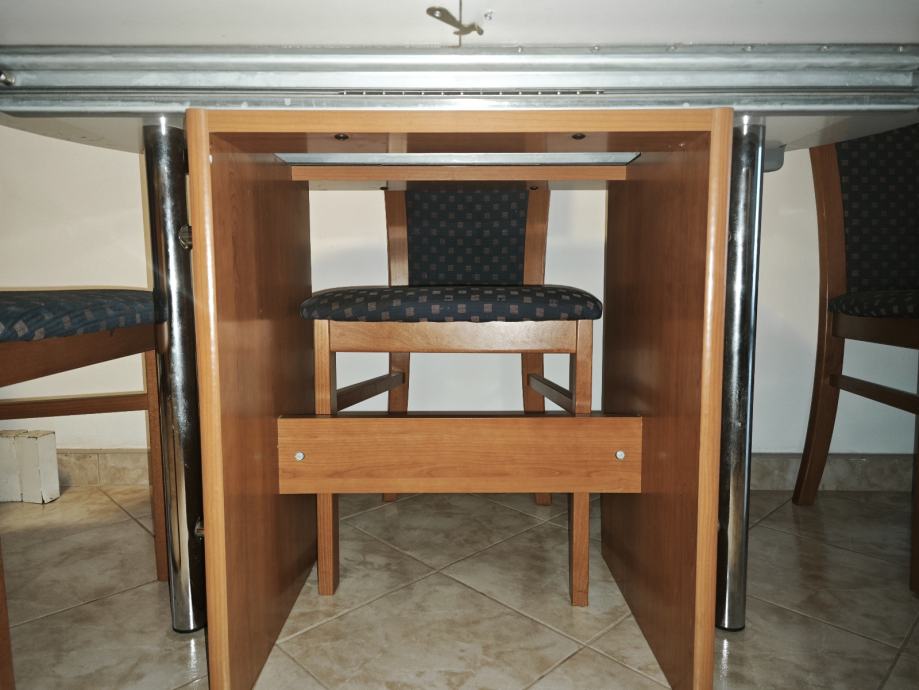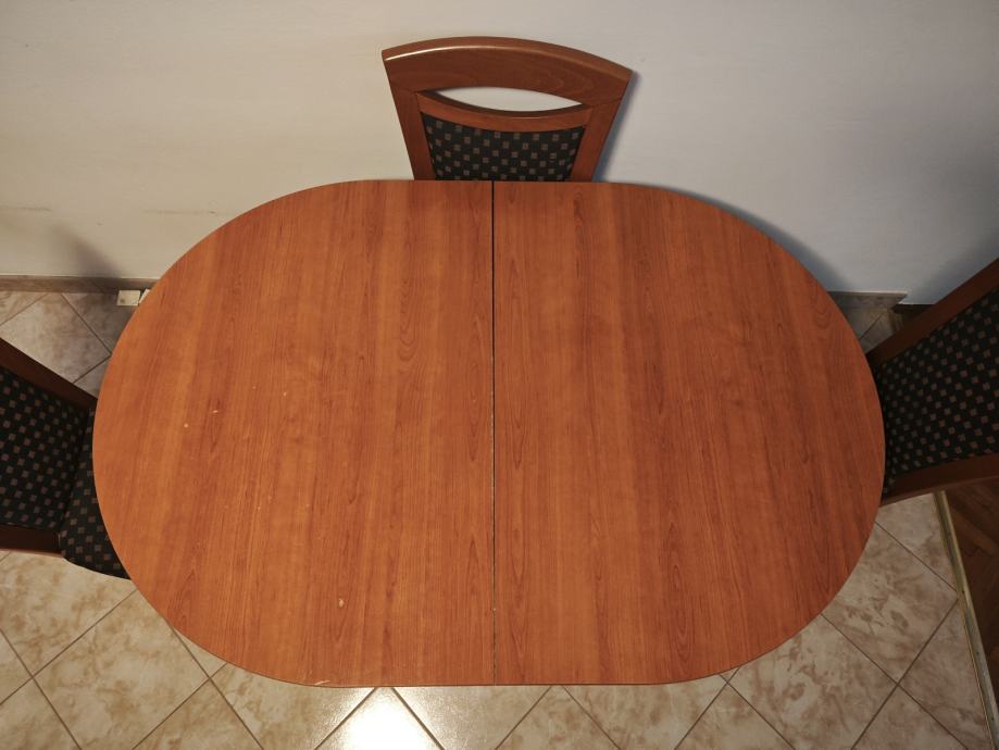 Prodajem blagovaonski stol s 6 stolica. Stol je ovalnog oblika, izrađen od drva u boji trešnje, s mehanizmom za proširenje koji omogućuje povećanje radne površine. Noge stola su metalne, kružnog presjeka u srebrnoj boji.