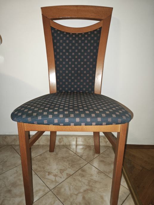 Stolice su drvene, u istoj boji kao i stol, s tapeciranim sjedalom i naslonom u plavoj tkanini s uzorkom kvadratića. Naslon stolice ima lijepo oblikovan gornji okvir s karakterističnim lučnim izrezom.