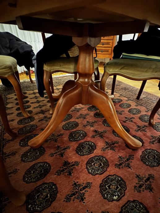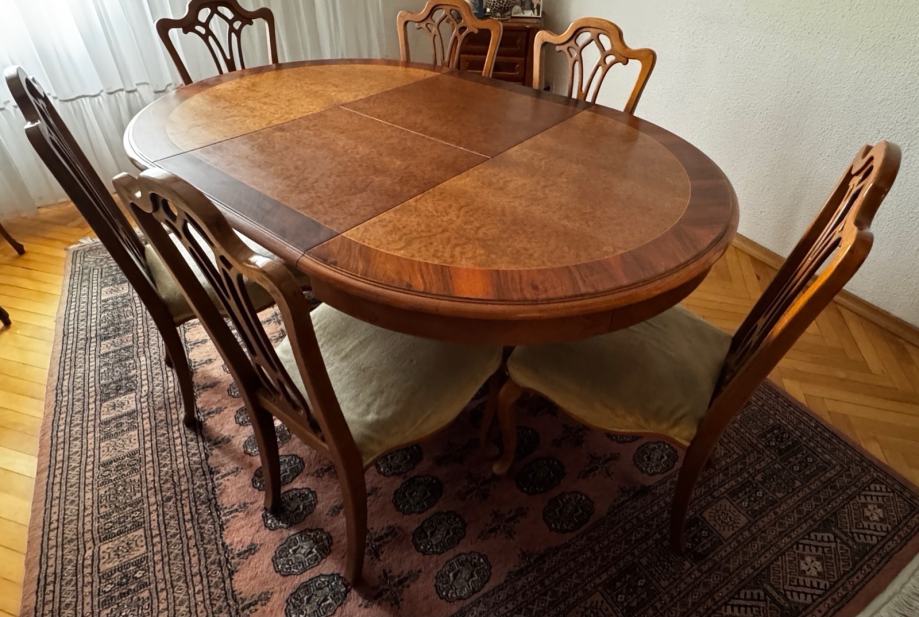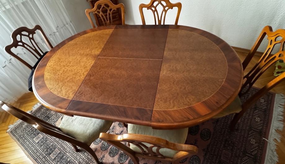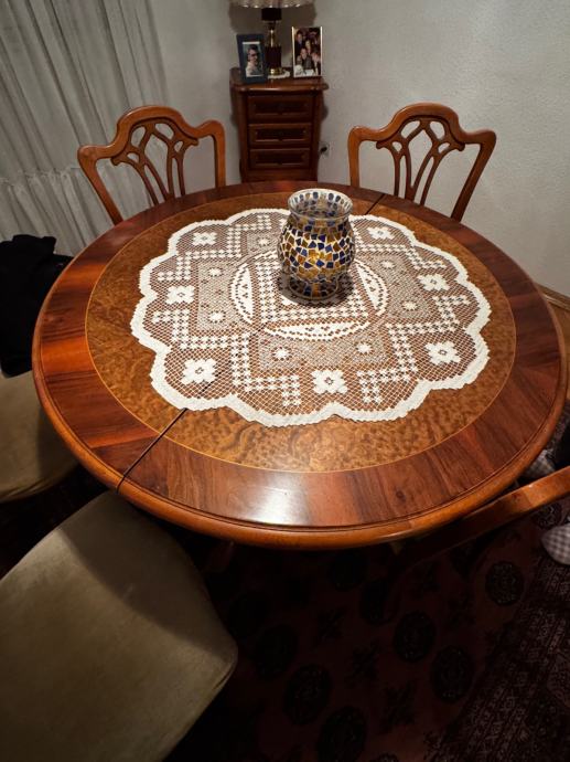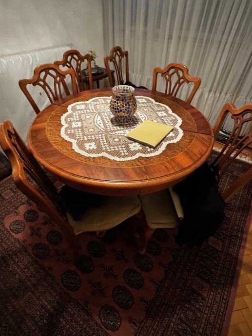 Prodajem retro blagovaonski okrugli stol (promjer 105 cm) od punog drveta sa 6 stolica. U odličnom stanju, uščuvano, bez oštećenja i ogrebotina.