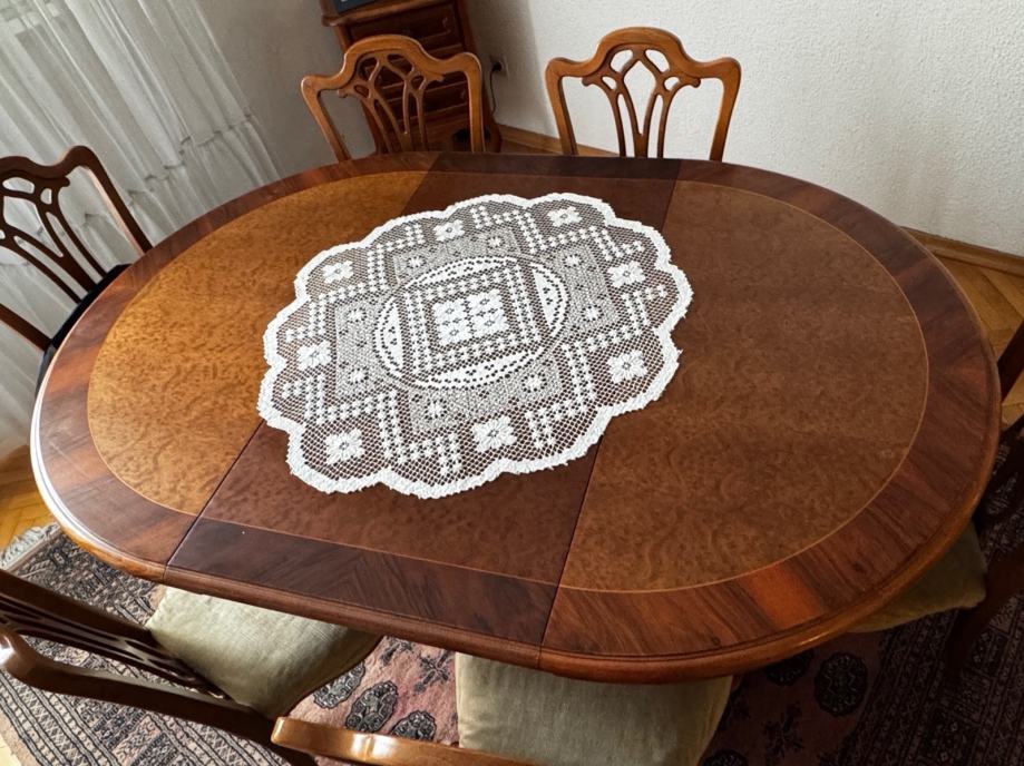 Svi konstrukcijski dijelovi stola i stolica (noge, mostovi, nasloni), su od punog drveta, na gornjoj ploči je ukrasni prirodni furnir sa uzorkom, lakirano)