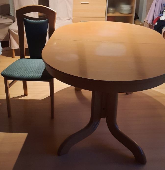 Uz stol prodajem 8 drvenih stolaca. Stolci su očuvani i tapicirani. Stol ima nekoliko ogrebotina.