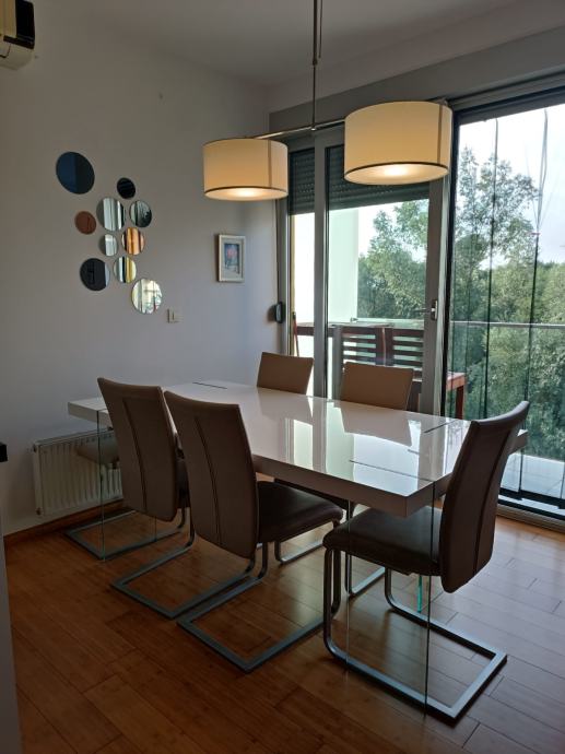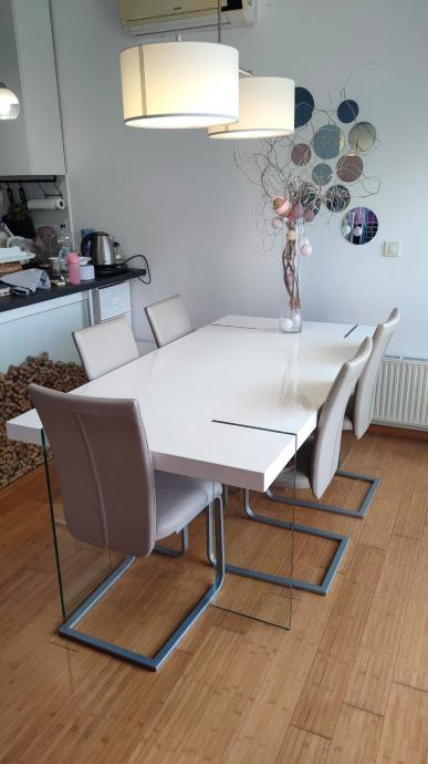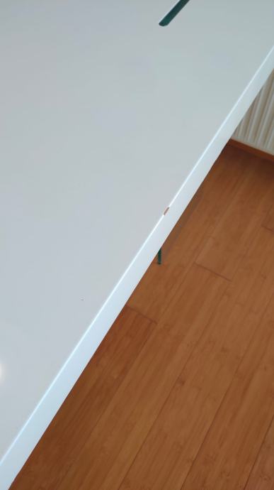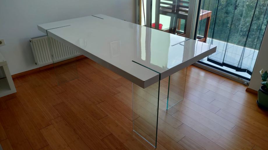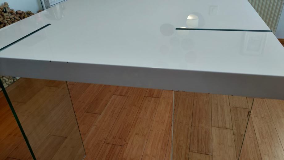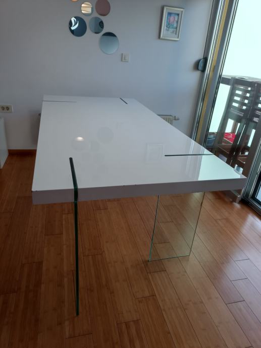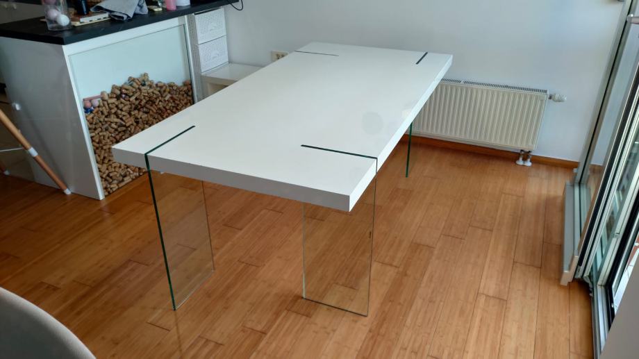Ploča stola je izrađena od mediapana pofarbanog bijelom bojom i lakom. Noge su izrađene od kaljenog stakla.