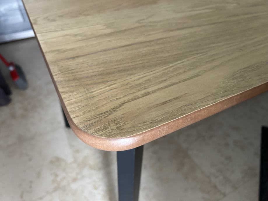 Stol se odlikuje modernim, minimalističkim dizajnom s kombinacijom prirodnih i tamnih tonova: