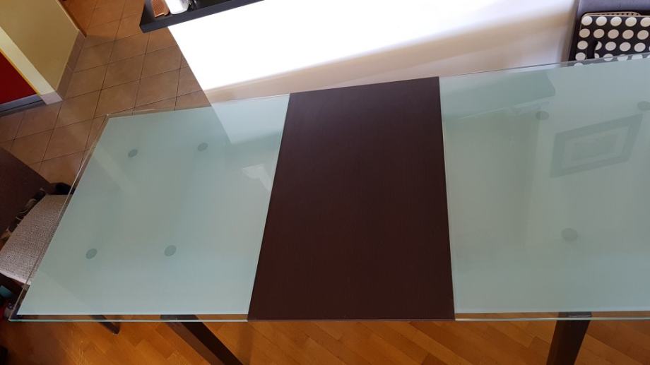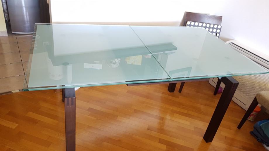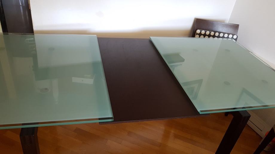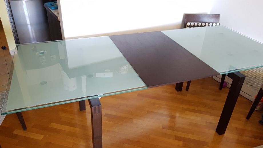 Prodajem stakleni stol Calligaris, dimenzija 160x90 s mehanizmom na razvlacenje, povrsina od kaljenog stakla, noge i dio kad se razvuce je drvo tamne boje wenge, kao novo (kupljeno u Art interijerima)