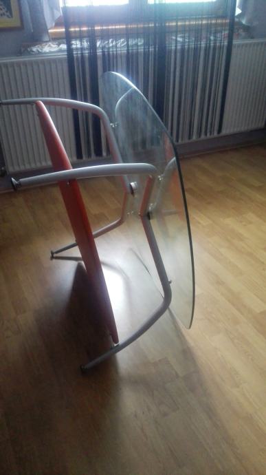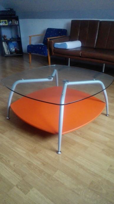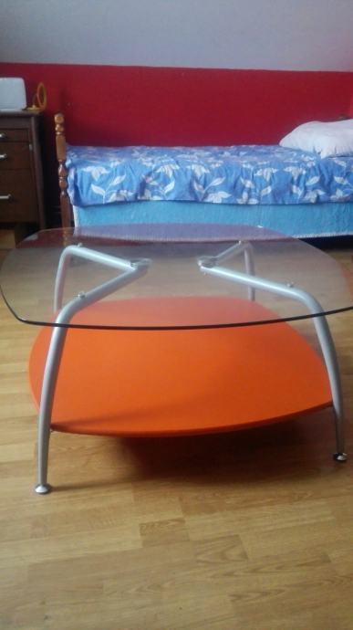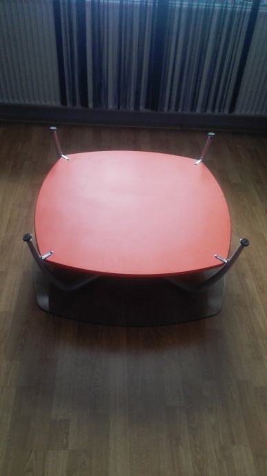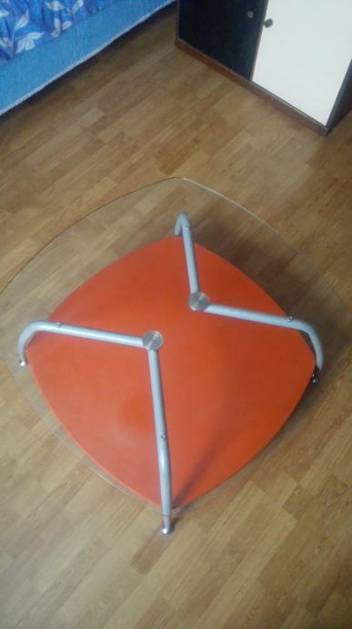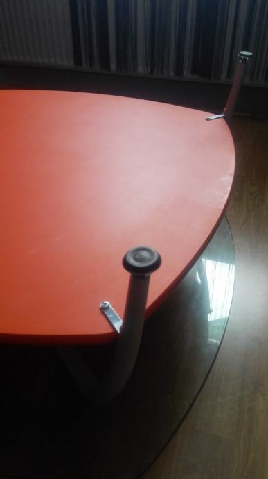 Gornja ploha je staklena a donja je drvena i povezan je metalnim nogicama.