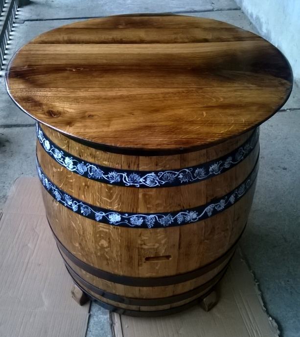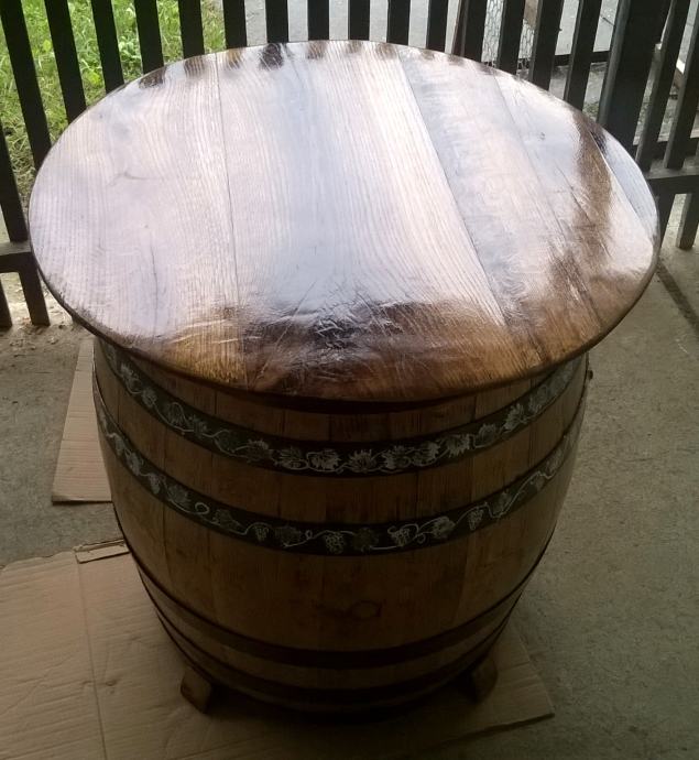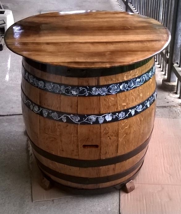 Stol od drvene hrastove bačve, visine 84 cm, promjera ploče 80 cm, unikat, ručni rad.