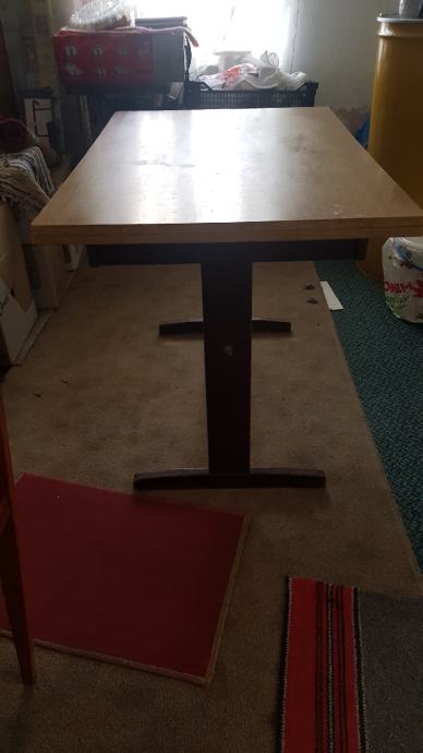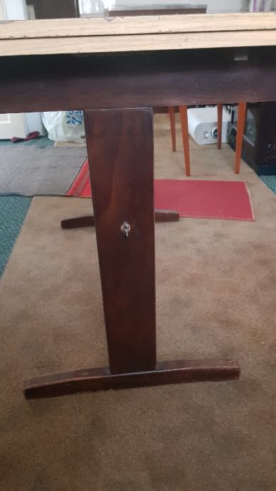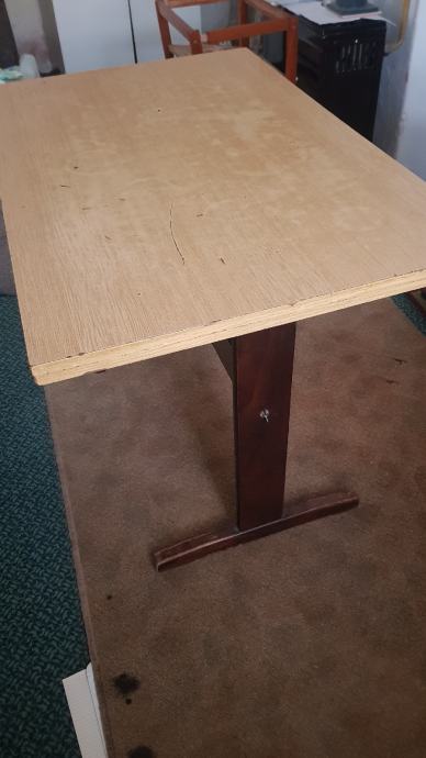 Drveni stol za blagovanje, praktičan jer je manjih dimenzija za manje prostorije. Dim 110x70 cm i visine 75 cm. Ploha stola može se povećati izvlačenjem s obje strane po 28 cm. Lijepe je svijetlo krem boje koja se lako održava. Noge stola su tamno smeđe boje i vrlo stabilan.