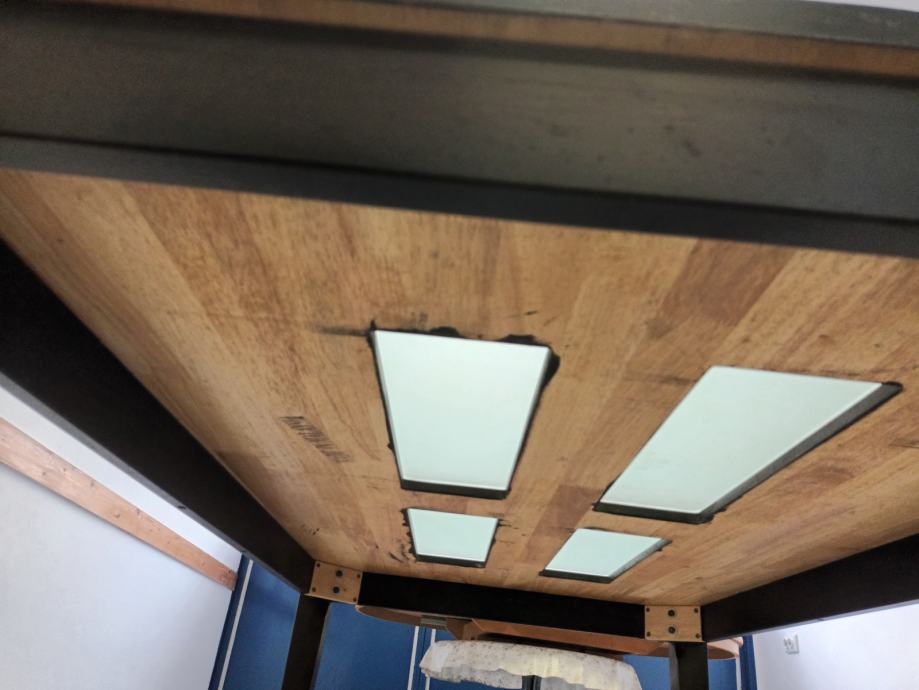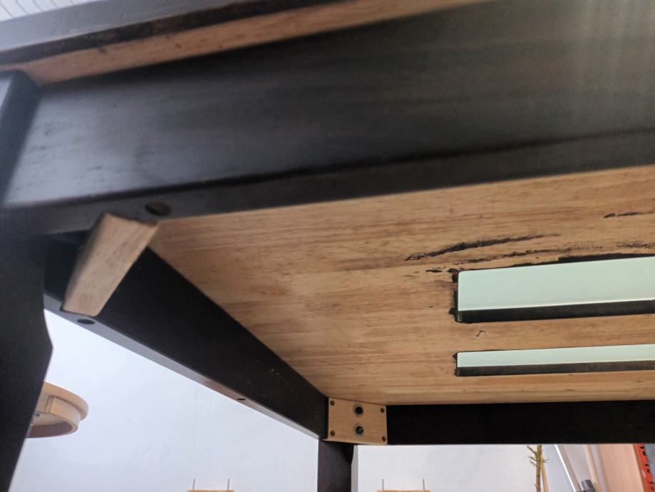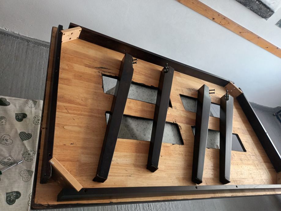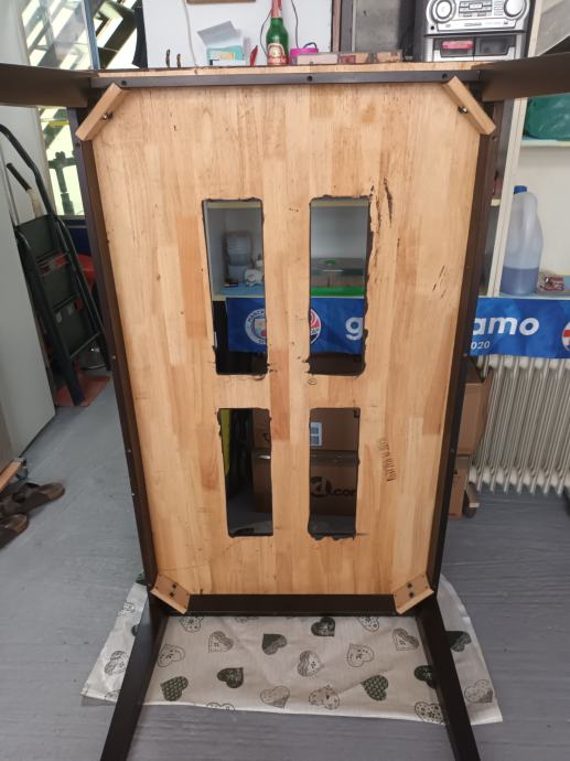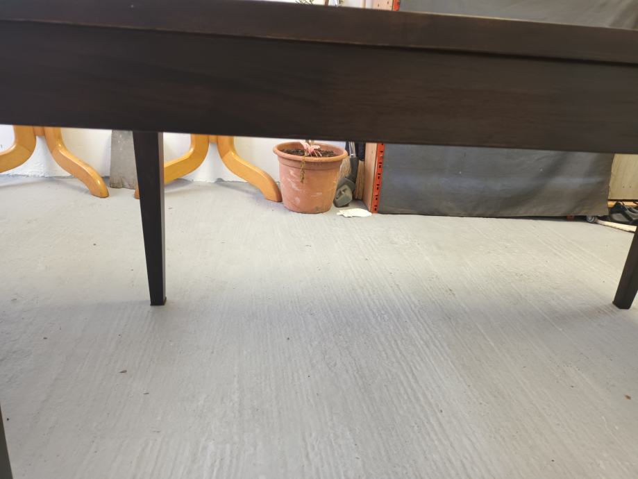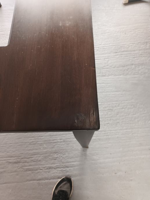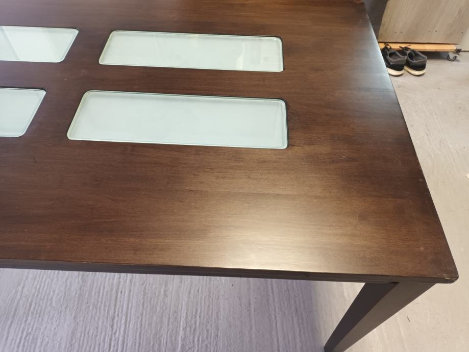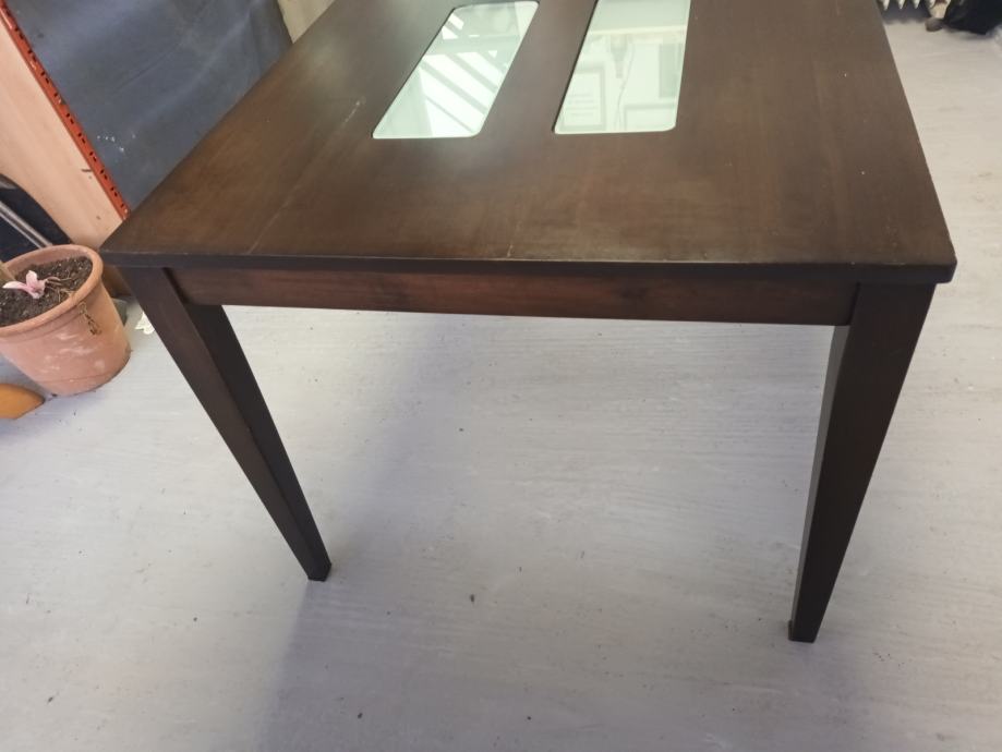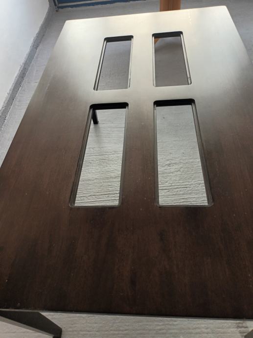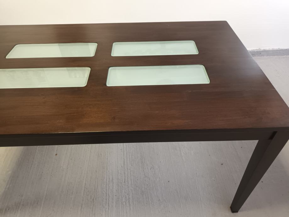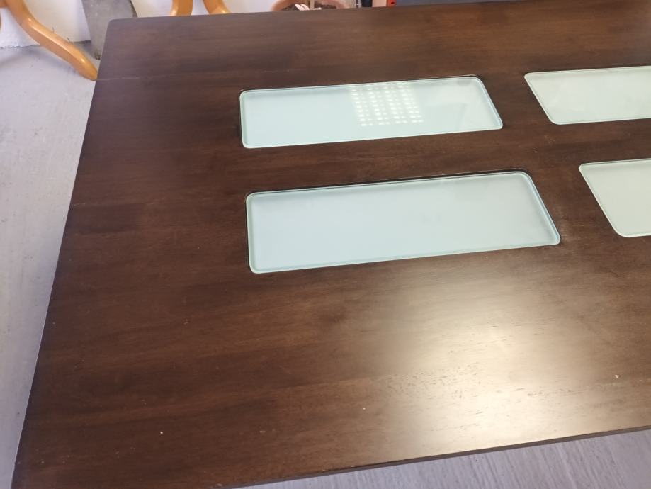Krasan drveni stol,sa staklenim elementima.dimenzije stola150x90,vis.77,boja smeđa tamna.staklo mat bijelo dim.45x15cm.debljina stakla8mm.