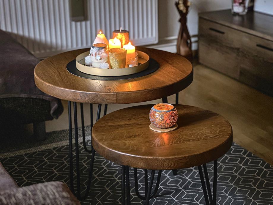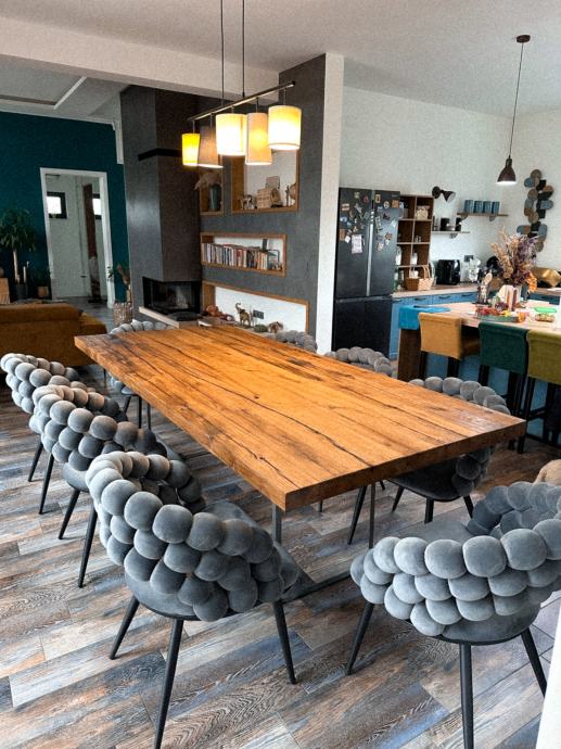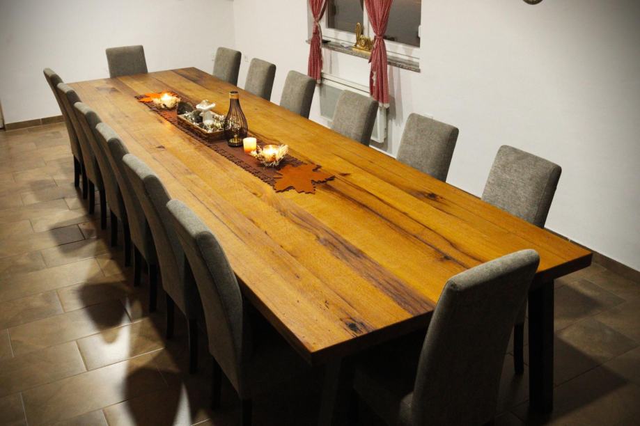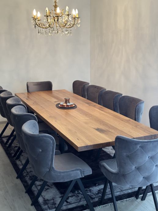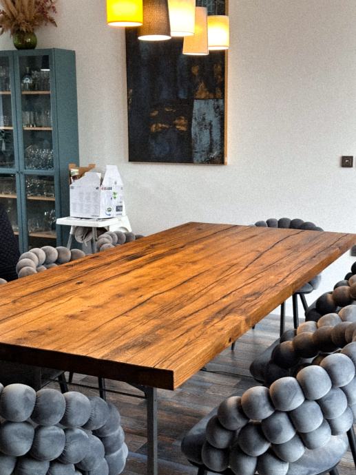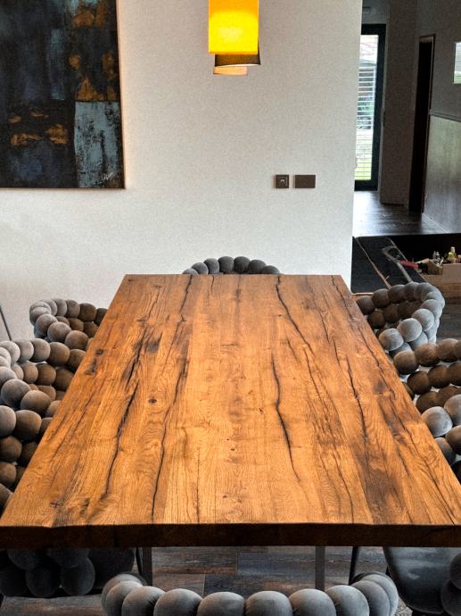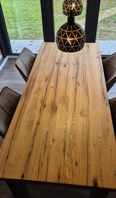 Stolovi od starog hrasta izrađeni prema mjeri i želji kupca. Svaka ploča stola jedinstvena je, izrađena od starog slavonskog hrasta, starog više od 100 godina, s karakterističnim i nezamjenjivim izgledom.