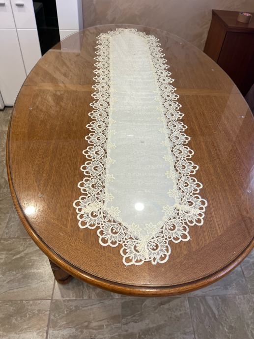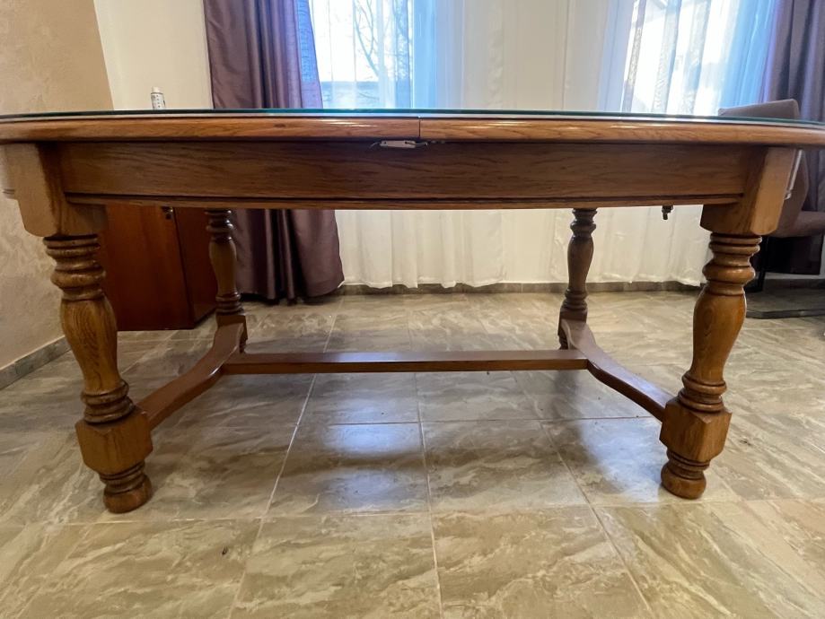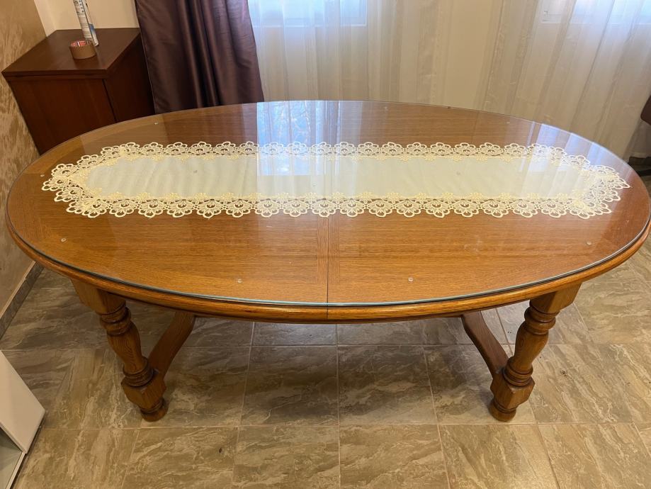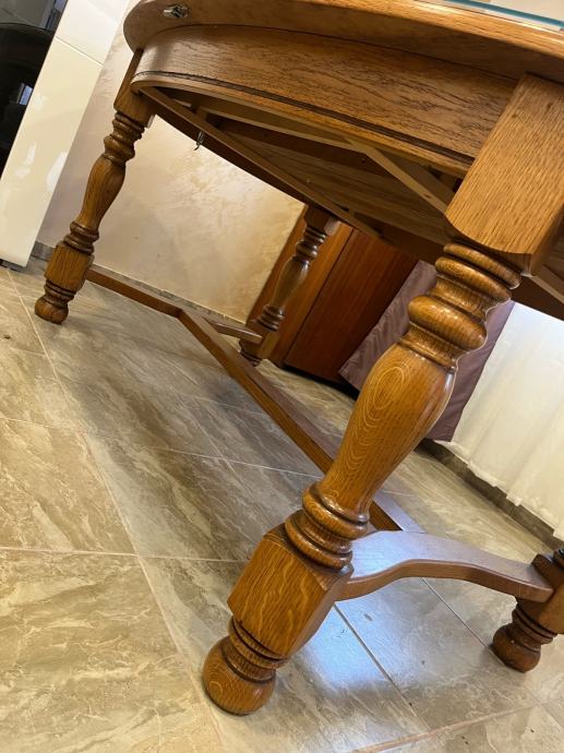 Prodajem blagovaonski stol od masivnog drveta, ovalnog oblika s klasičnim tokarenim nogama i poprečnom prečkom koja ih povezuje. Stol je tople smeđe boje s lijepom strukturom drva vidljivom na površini. Solidne je i čvrste izrade, a gornja ploča prekrivena je zaštitnim staklom.